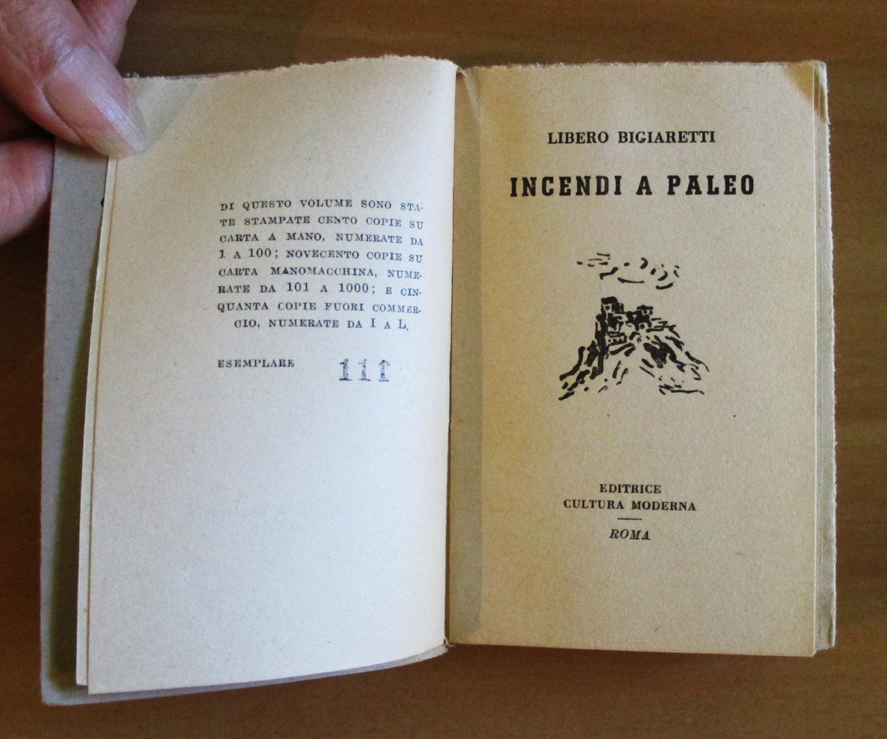 Collana Del Girasole N. 3. Due piccole illustrazioni in bianco e nero alla copertina e al frontespizio e ritratto dell'autore in antiporta di Orfeo Tamburi. Editore Cultura Moderna - Roma, I edizione 1945. Edizione in Tiratura Limitata in 1000 copie, nostro N.111 Brossura editoriale con ali. 7x11; pp.91. Raro, Ottimo stato