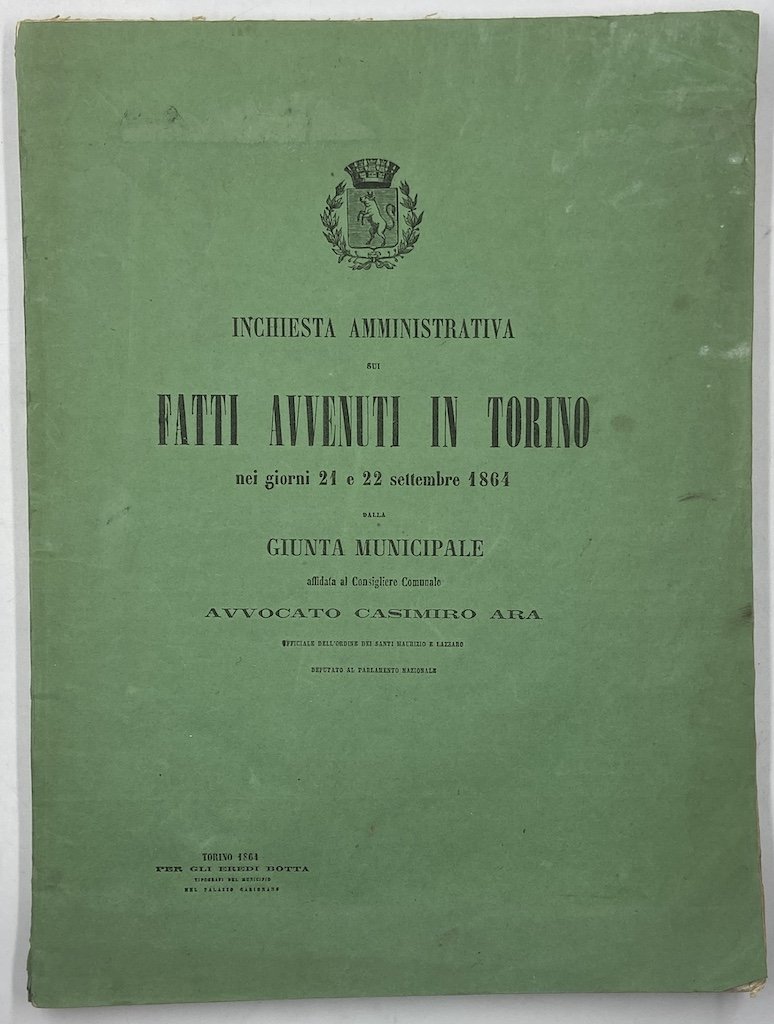 INCHIESTA AMMINISTRATIVA SUI FATTI AVVENUTI IN TORINO nei giorni 21 e 22 settembre 1864 dalla GIUNTA MUNICIPALE affidata al Consigliere Comunale AVVOCATO CASIMIRO ARA. TORINO 1864 PER GLI EREDI BOTTA Tipografi del Municipio nel Palazzo Carignano.