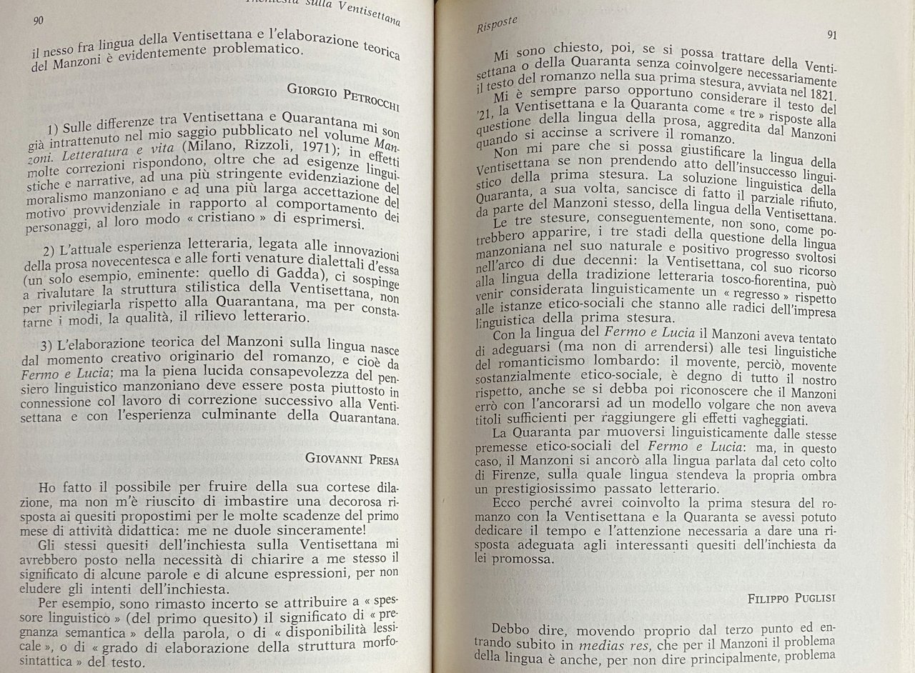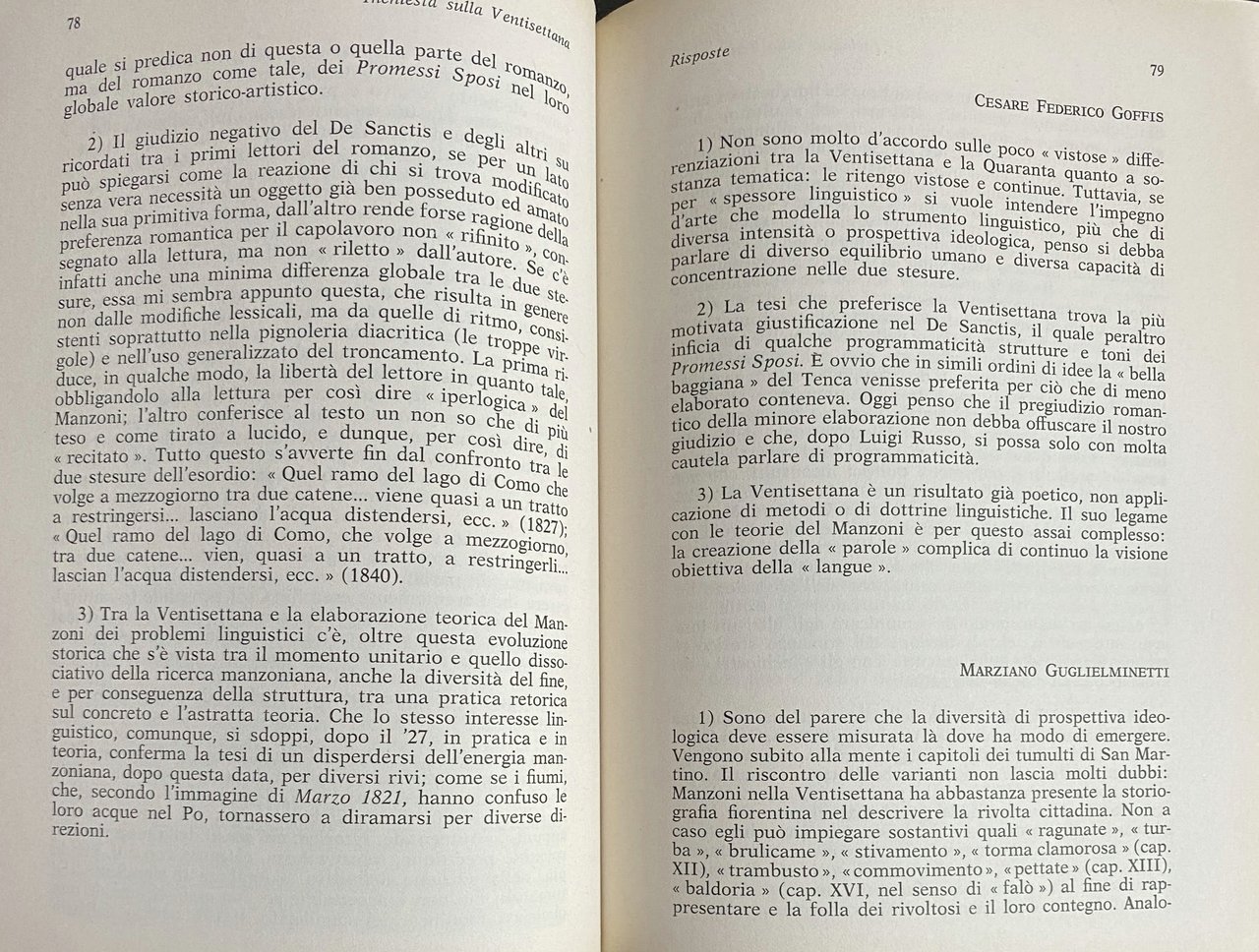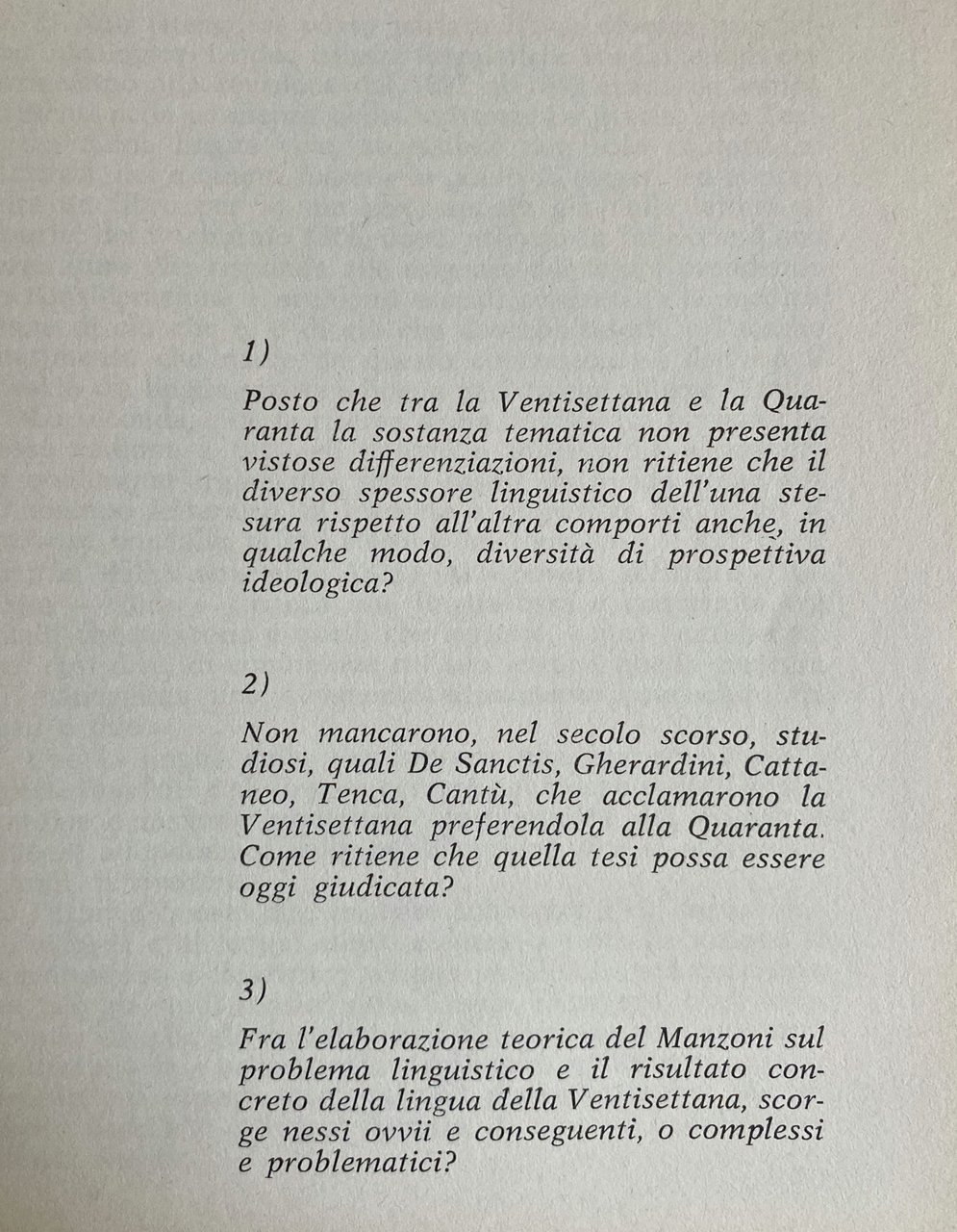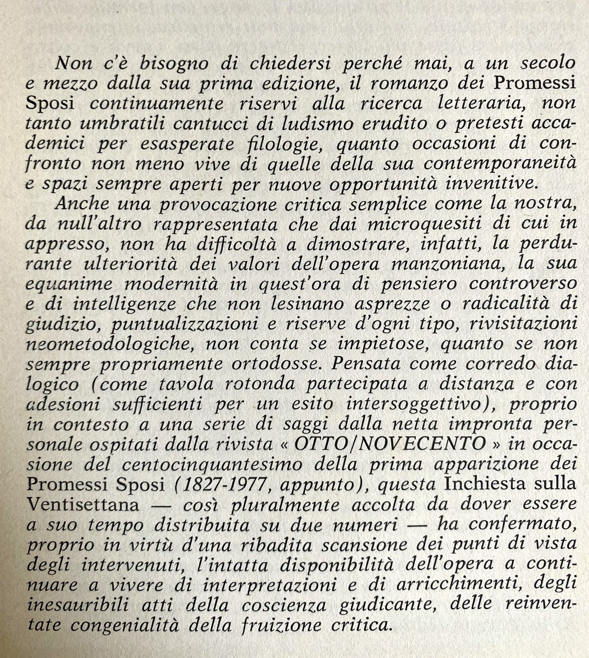 Non c'è bisogno di chiedersi perché mai, a un secolo e mezzo dalla sua prima edizione, il romanzo dei Promessi Sposi continuamente riservi alla ricerca letteraria, non tanto umbratili cantucci di ludismo erudito o pretesti accademici per esasperate filologie, quanto occasioni di confronto non meno vive di quelle della sua contemporaneità e spazi sempre aperti per nuove opportunità invenitive. Anche una provocazione critica semplice come la nostra, da null'altro rappresentata che dai microquesiti di cui in appresso, non ha difficoltà a dimostrare, infatti, la perdurante ulteriorità dei valori dell'opera manzoniana, la sua equanime modernità in quest'ora di pensiero controverso e di intelligenze che non lesinano asprezze o radicalità di giudizio, puntualizzazioni e riserve d'ogni tipo, rivisitazioni neometodologiche, non conta se impietose, quanto se non sempre propriamente ortodosse. Pensata come corredo dialogico (come tavola rotonda partecipata a distanza e con adesioni sufficienti per un esito intersoggettivo), proprio in contesto a una serie di saggi dalla netta impronta personale ospitati dalla rivista OTTO/NOVECENTO in occasione del centocinquantesimo della prima apparizione dei Promessi Sposi (1827-1977), questa Inchiesta sulla Ventisettana così pluralmente accolta da dover essere a suo tempo distribuita su due numeri ha confermato, proprio in virtù d'una ribadita scansione dei punti di vista degli intervenuti, l'intatta disponibilità dell'opera a continuare a vivere di interpretazioni e di arricchimenti, degli inesauribili atti della coscienza giudicante, delle reinventate congenialità della fruizione critica.