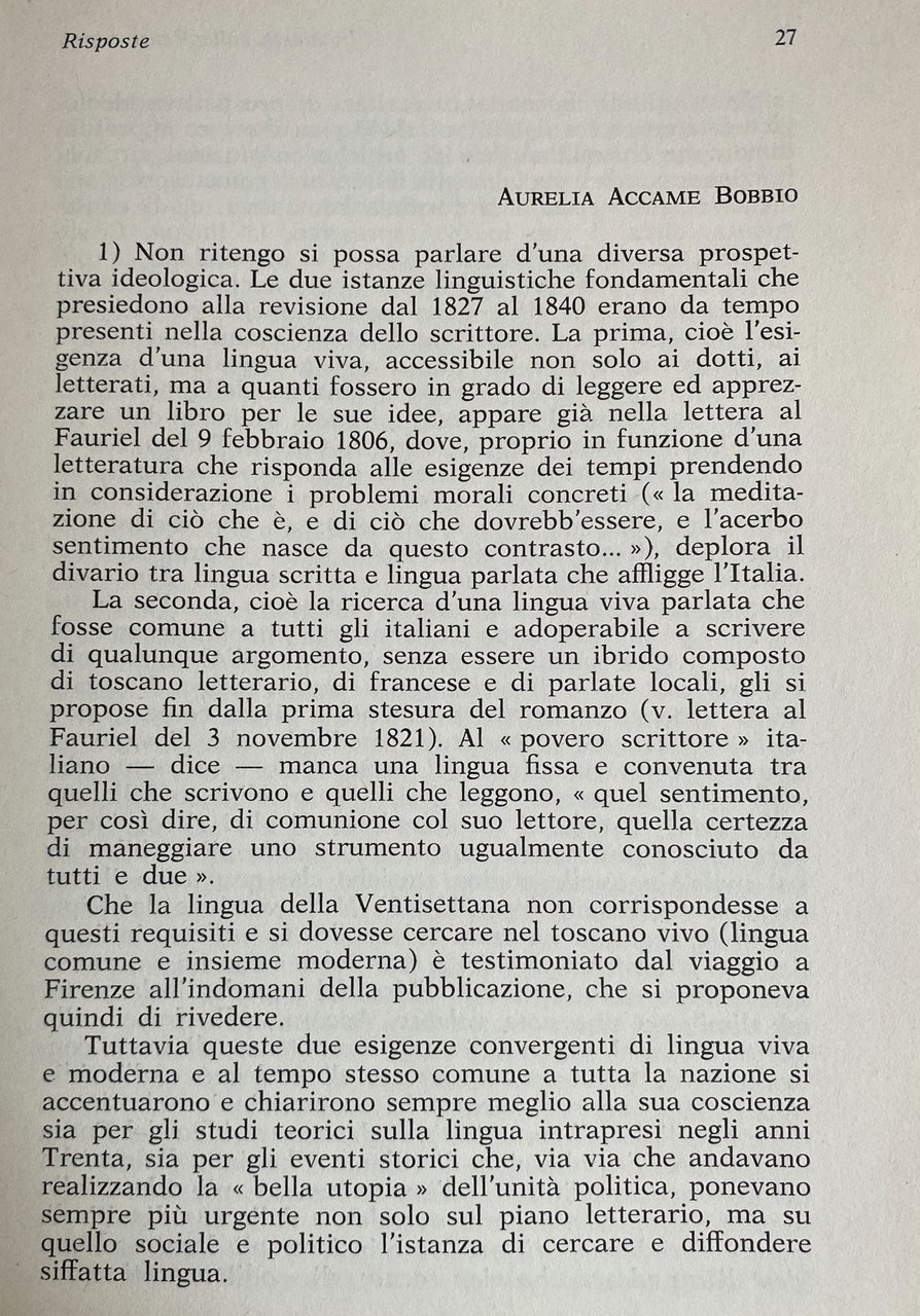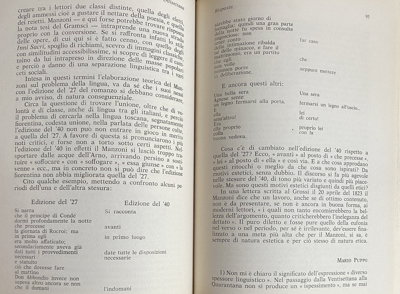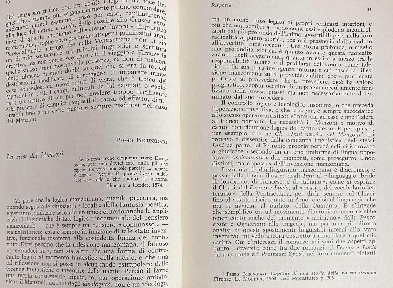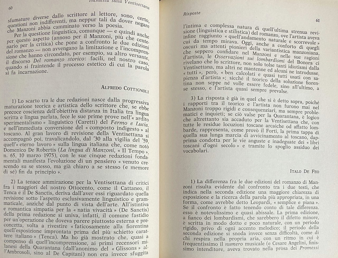 Non c'è bisogno di chiedersi perché mai, a un secolo e mezzo dalla sua prima edizione, il romanzo dei Promessi Sposi continuamente riservi alla ricerca letteraria, non tanto umbratili cantucci di ludismo erudito o pretesti accademici per esasperate filologie, quanto occasioni di confronto non meno vive di quelle della sua contemporaneità e spazi sempre aperti per nuove opportunità invenitive. Anche una provocazione critica semplice come la nostra, da null'altro rappresentata che dai microquesiti di cui in appresso, non ha difficoltà a dimostrare, infatti, la perdurante ulteriorità dei valori dell'opera manzoniana, la sua equanime modernità in quest'ora di pensiero controverso e di intelligenze che non lesinano asprezze o radicalità di giudizio, puntualizzazioni e riserve d'ogni tipo, rivisitazioni neometodologiche, non conta se impietose, quanto se non sempre propriamente ortodosse. Pensata come corredo dialogico (come tavola rotonda partecipata a distanza e con adesioni sufficienti per un esito intersoggettivo), proprio in contesto a una serie di saggi dalla netta impronta personale ospitati dalla rivista OTTO/NOVECENTO in occasione del centocinquantesimo della prima apparizione dei Promessi Sposi (1827-1977), questa Inchiesta sulla Ventisettana così pluralmente accolta da dover essere a suo tempo distribuita su due numeri ha confermato, proprio in virtù d'una ribadita scansione dei punti di vista degli intervenuti, l'intatta disponibilità dell'opera a continuare a vivere di interpretazioni e di arricchimenti, degli inesauribili atti della coscienza giudicante, delle reinventate congenialità della fruizione critica.