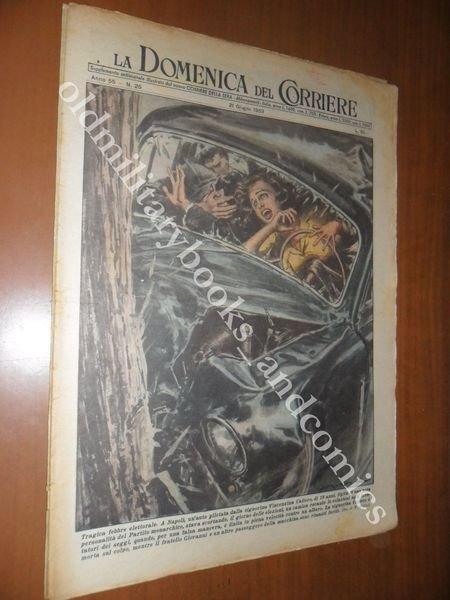 DESCRIZIONE: Domenica del Corriere, Milano, Anno 55 n. 25 (21 Giugno 1953). COPERTINA: "Tragica febbre elettorale. A Napoli, un'auto pilotata dalla signorina Vincenzina Cafiero, di 18 anni, figlia di una nota personalità del partito monarchico, stava scortando, il giorno delle elezioni, un camion recante le colazione agli scrutatori dei seggi, quando, per una falsa manovra, è finita in piena velocità contro un albero. La signorina Cafiero è morta sul colpo, mentre il fratello Giovanni e un altro passeggero della macchina sono rimasti feriti." (dis. W. Molino) RETRO: "Vola senza pattini Sonia Henie. La campionessa di pattinaggio, svegliata all'improvviso da un ladro che frugava in un mobiletto della sua stanza a Londra, è balzata urlando dal letto e coraggiosamente s'è data, così come si trovava, all'inseguimento del malandrino ma invano. Bilancio del furto: 29.000 dollari oltre a vari preziosi." (dis. W. Molino) CONDIZIONI: Buono. Con spille e sovraccoperta, alcune macchiette. PESO / WEIGHT: 100 gr. without package