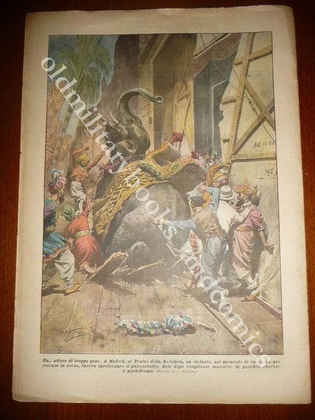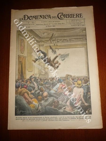 DESCRIZIONE: LA DOMENICA DEL CORRIERE 19 giugno 1927 n. 25 In copertina: In un cinematografo di Parigi un operaio che era salito per aprire i lucernari rompe i vetri e precipita sul pubblico. Al retro: A Madrid al teatro della Zarzuela, un elefante sfonda il palcoscenico. CONDIZIONI DELL'OGGETTO: Ottime senza sovracc. azzurrina, con pieghette. PESO/WEIGHT: 47 g without package