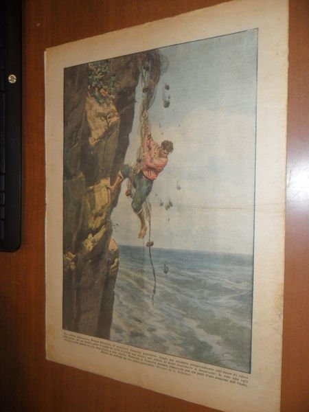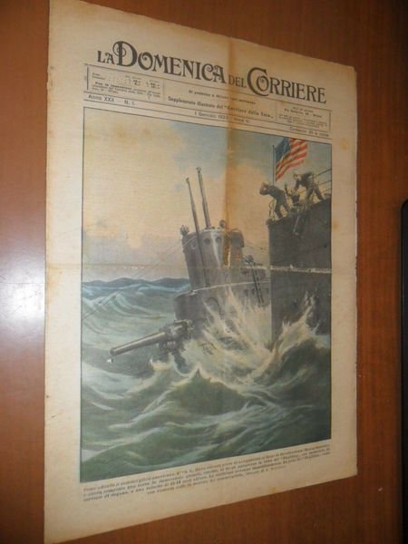 DESCRIZIONE: Domenica del Corriere, Milano, Anno XXX n. 1 (1 Gennaio 1928-VI). COPERTINA: "Come affondò il sommergibile americano. L'S4 stava facendo prove di navigabilità al largo di Provincetown (Massachussets), e aveva compiuto una corsa in immersione quando, emerso, si trovò attraverso la rotta del Paulding che incrociava in servizio di dogana, a una velocità di 15-18 nodi l'ora. La collisione avvenne immediatamente e la prua del Paulding cozzò con violenza sotto la torretta del sommergibile." (dis. A. Beltrame) RETRO: "Una brutta avventura. Presso Siracusa, il pescatore Campisi procedeva lungo un sentiero strapiombante sul mare da circa 150 metri. Ad un tratto, mise il piede in fallo e cadde nel vuoto; ma subito si sentì trattenere a mezz'aria: la rete che egli portava sulle spalle si era impigliata a una roccia. Tuttavia il Campisi dovette rimanere per un paio d'ore sospeso nel vuoto, finchè fu salvato da un altro pescatore." (dis. A. Beltrame) La Domenica del Corriere è stato un popolare settimanale italiano fondato a Milano nel 1899 e chiuso nel 1989. Apparve per la prima volta nelle edicole l'8 gennaio 1899 come supplemento illustrato del Corriere della Sera. Stampata in grande formato (sul modello del domenicale La Tribuna illustrata), aveva 12 pagine e veniva distribuita gratis agli abbonati del Corriere, oppure si poteva acquistare in edicola per 10 centesimi. La prima e ultima di copertina erano sempre disegnate. Il Corriere si avvaleva di un giovane disegnatore, Achille Beltrame, allora sconosciuto, a cui veniva affidato in ogni numero il compito di rendere con la sua tavola il fatto più interessante della settimana. Dopo la sua morte nel 1945, fu sostituito da Walter Molino che, come il suo predecessore, firmò memorabili copertine. A differenza dei settimanali dell'epoca, la Domenica del Corriere diede ampio spazio alle fotografie e ai disegni, e questo fu uno dei motivi del suo successo. CONDIZIONI: Buone. Senza spille e sovraccoperta, con pieghe e strappetti. PESO / WEIGHT: 100 gr. without package