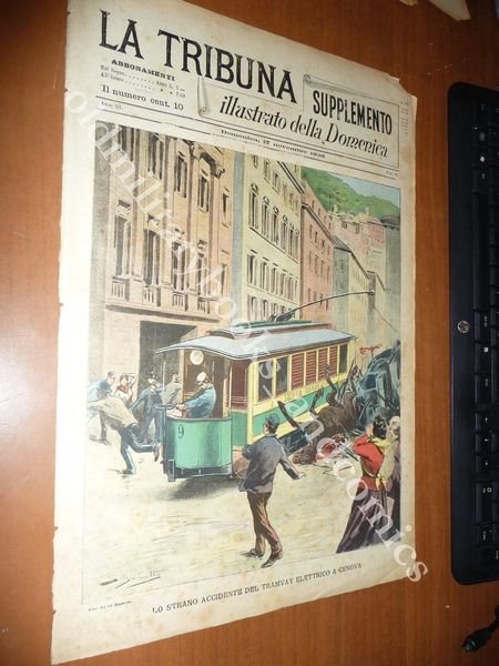 DESCRIZIONE: La Tribuna (Supplemento Illustrato della Domenica), Roma, Anno III n. 46 (17 Novembre 1895). COPERTINA: "Lo strano accidente del tramway elettrico a Genova" (ill. sconosciuto). RETRO: "Un episodio dell'insurrezione di Cuba. Il capo insorto Rego restituisce agli Spagnuoli quindici prigionieri" (ill. sconosciuto). La Tribuna illustrata fu un settimanale italiano pubblicato a Roma. Fondato nel 1890 come supplemento del quotidiano La Tribuna, il primo numero uscì il 6 gennaio. Il formato della rivista era 27x38 cm e ogni numero conteneva 16 pagine. In breve tempo divenne il primo settimanale illustrato italiano. Nella prima metà del XX secolo, rivaleggia con il settimanale del Corriere della Sera, La Domenica del Corriere. CONDIZIONI: Sufficiente. Non spillato, prov. da rilegatura. Mancanze agli angoli. PESO / WEIGHT: 100 gr. without package