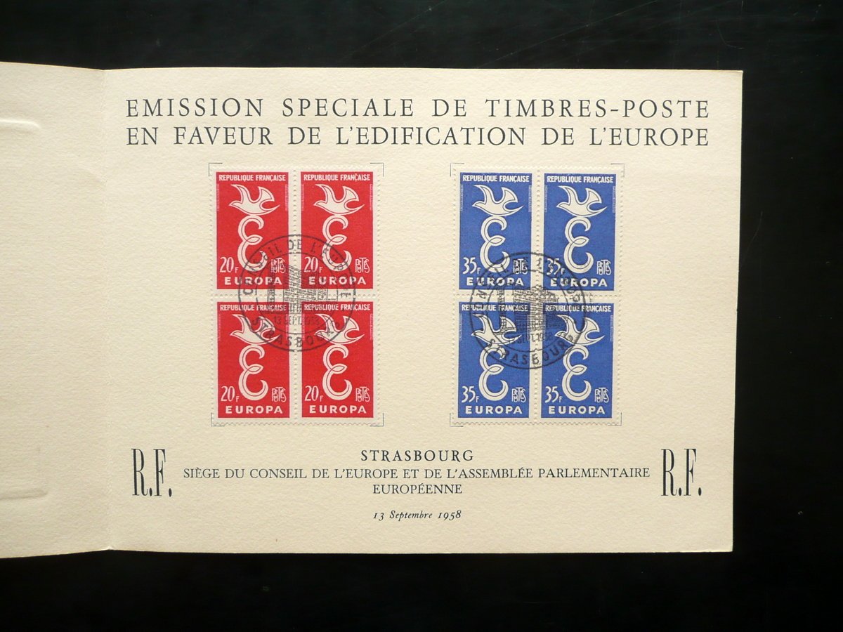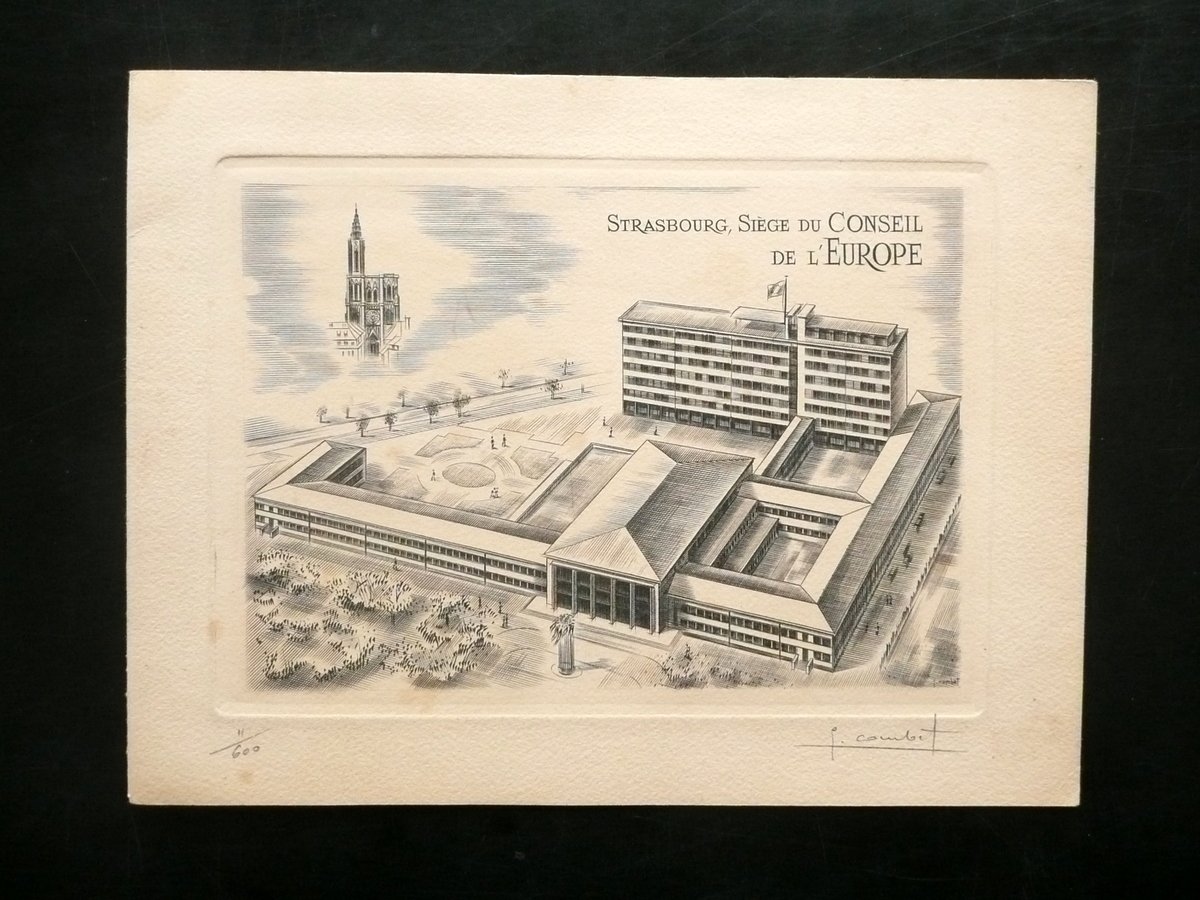 Placchetta, Strasbourg Siège du Conseil de l'Europe Emission speciale de timbres - poste en faveur de l'edification de l'Europe Mancanza dei dati tipografici, 1958; placchetta con una bella incisione in b/n della Sede del Consiglio d'Europa, che contiene alcune marche da bollo speciali emesse in favore dell'edificazione dell'Unione Europea. Cm 15x20. Condizioni di conservazione Esemplare ben conservato con minime tracce d'uso, pochi minimi aloni e bruniture. SC03.D10572 N