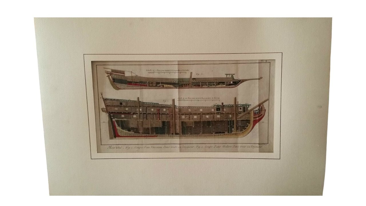 Incisione Acquarellata Spaccato Navale "Marine Vaisseau Et Galere" B. Direx