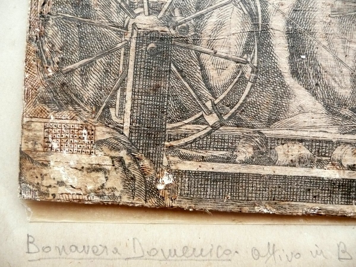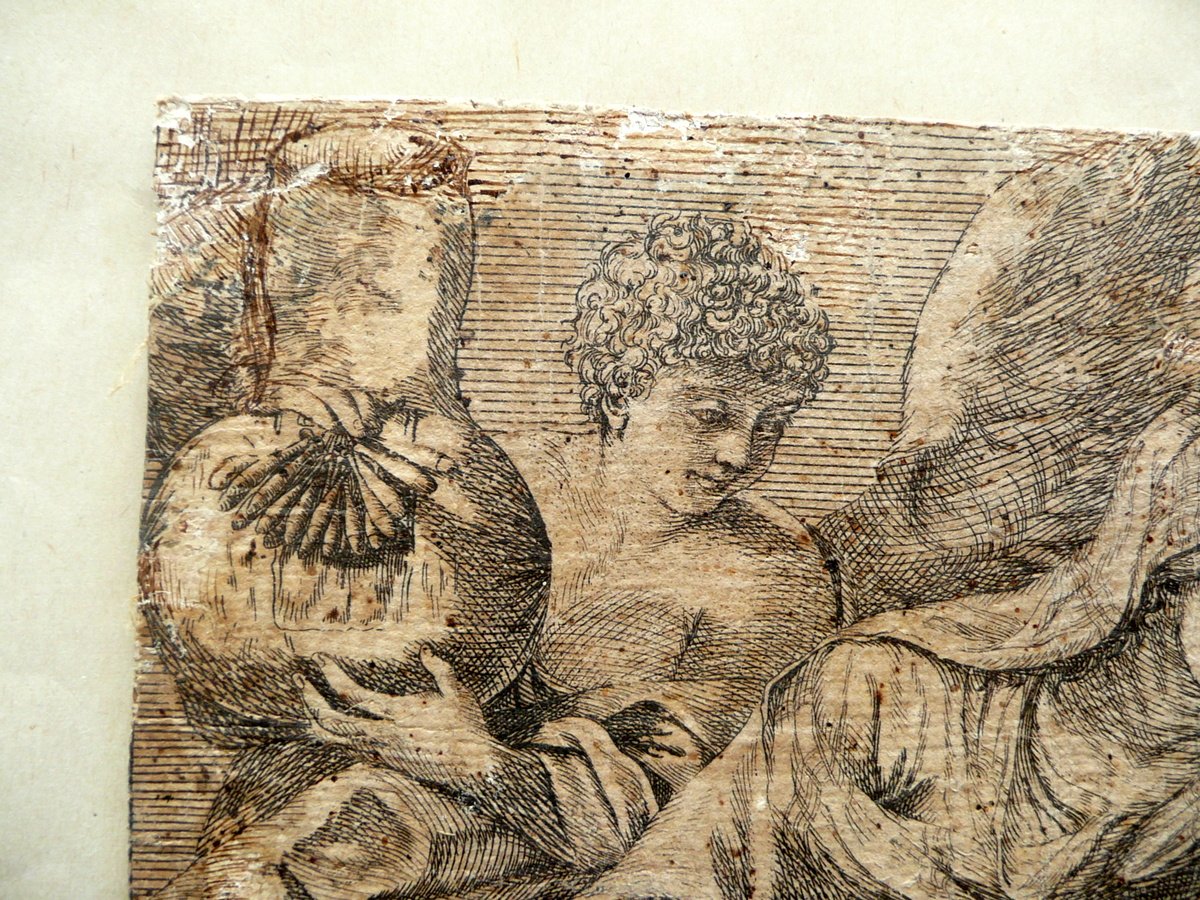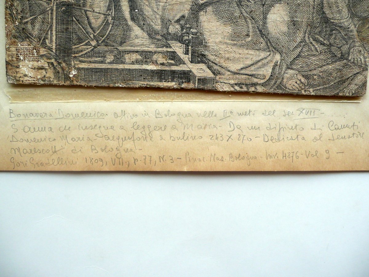 Acquaforte originale, S. Anna che insegna a leggere a Maria" Acquaforte originale a bulino realizzata da Domenico Bonaventura Da un dipinto di Domenico Maria Canuti Seconda metà del Seicento S. d. (seconda metà del Seicento circa); bella acquaforte a bulino originale in b/n, applicata su supporto in tela, a sua volta precedentemente applicata su supporto in carta; margine inf. del supporto in carta con alcune annotazioni descrittive e riferimenti bibliografici redatti a matita dal precedente collezionista (vedi foto); un angolo sup. dell'incisione con timbretto - ex libris del precedente proprietario. Cm 20,5x27 (incisione); cm 31x45,5 (supporto in carta). Condizioni di conservazione Incisione complessivamente ben conservata con tracce del tempo; minuscole bruniture; alcune piccole mancanze e abrasioni, in parte reintegrate con tratti ad inchiostro d'epoca (vedi foto); margini con minime irregolarità. SC03.D11017 N F "