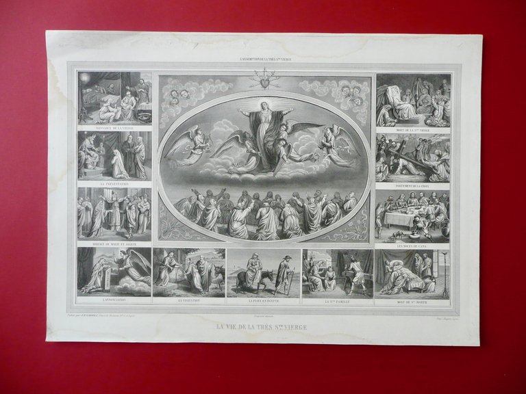 Grande incisione, La Vie de la très S.te Vierge Imp. Fugère - Lyon J. B. Gadola, Lyon, s. d. (metà '800 circa); grande tavola incisa in b/n; retro bianco. Didascalie in francese. Cm 32,5x45. Condizioni di conservazione Esemplare complessivamente ben conservato con tracce d'uso, alcune leggere ombre di gore che non compromettono le illustrazioni, margini e angoli con leggerissime abrasioni. SC03.D13936 N F