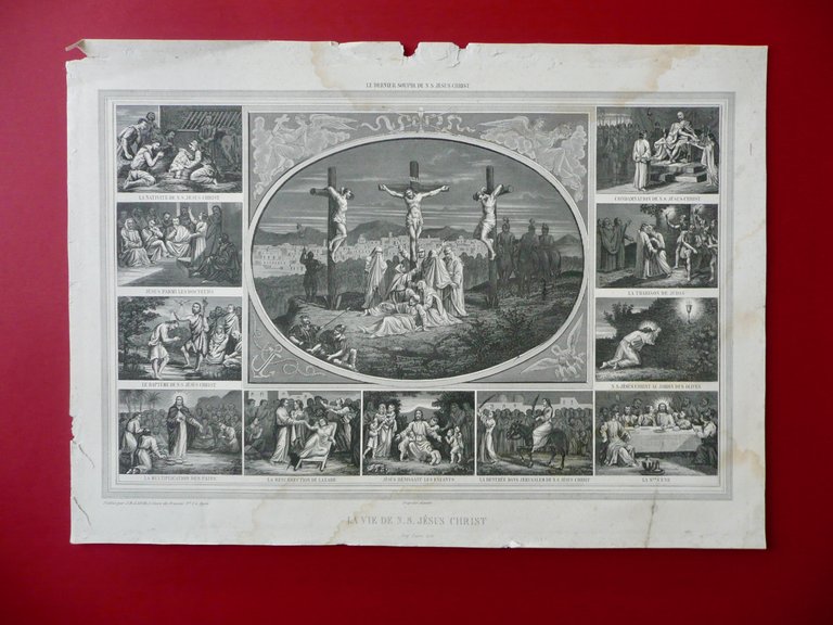 Grande incisione, La Vie de N. S. Jesus Christ Imp. Fugère - Lyon J. B. Gadola, Lyon, s. d. (metà '800 circa); grande tavola incisa in b/n; retro bianco. Didascalie in francese. Cm 32,5x45. Condizioni di conservazione Esemplare complessivamente ben conservato con tracce d'uso, alcune leggere ombre di gore che non compromettono le illustrazioni, margini e angoli con leggerissime abrasioni e poche piccole mancanze. SC03.D13935 N F
