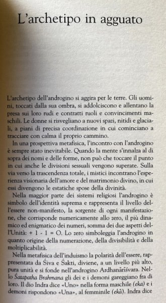 Soggetti: Ermafroditismo, Androgino, Società, Dottrine religiose, Oggetti di culto e di venerazione, Natura, Astrazioni Personificate, Archetipi, Erotismo, Sessualità, Femminilità, Mascolinità, Maschi, Femmine, Donne, Uomini, Differenze, Storia, Antichità, Cultura classica greco-romana, Grecia antica, Impero romani, Giovani, Mitologia, Simbolismo, Fallo, Iconografia, Religione, Eros, Psiche, Chiesa, Antiche civiltà, Maya, Cristianesimo, Dèi, Divinità, Mercurio, Teologia, Letteratura, Orlando, Virginia Woolf, Giovanni Battista, Sciamanesimo, Castaneda, Sciamani, Taoismo, Tantrismo, Tantra, India, Ebraismo, Tradizione esoterica ebraica, Riforma, Filosofia, Esoterismo, Mistica, Studi culturali, Psicologia, Antropologia, Etnologia, Terra, Dioniso, Ausonio, Cupido, Venere, Amore, Gabriel de Foigny, Thomas Artus, de Sade, Giordano Bruno, Cristo, Zeus, Bisessualità, Adamo, Eva, Corpo, Creazione, Femminino, Platone, Identità, The Androgyne: Fusion of the Sexes, Generi sessuali, Caratteri, Androginia, Reconciliation of Male and Female, Hermaphrodisme, l'Antiquité gréco-romaine, Libri Vintage fuori catalogo, Western and Eastern thought, Mystique, Eunuchi, Canto, Etica, Omosessualità, Hermaphroditism, Androgynous, Society, Religious doctrines, Objects of worship and veneration, Nature, Personalized Abstractions, Archetypes, Eroticism, Sexuality, Femininity, Masculinity, Males, Females, Women, Men, Differences, History, Antiquity, Classical Greco-Roman culture, Ancient Greece, Roman empire, Young people, Mythology, Symbolism, Phallus, Iconography, Religion, Psyche, Church, Ancient civilizations, Christianity, Gods, Divinity, Mercury, Theology, Literature, John the Baptist, Shamanism, Shamans, Taoism, Tantrism, Judaism, Jewish esoteric tradition, Reformation, Philosophy, Esotericism, Mysticism, Cultural studies, Leonardo da Vinci, Psychology, Anthropology, Ethnology, Earth, Dionysus, Ausonius, Cupid, Venus, Love, Christ, Bisexuality, Adam, Eve, Body, Creation, Feminine, Plato, Identity, Sexual Genres, Characters, Androgyny, Books out of print, Eunuchs, Singing, Ethics, Homosexuality, l'umana nostalgia dell'interezza, Numero Zero, Afrodite, Pulcinella, Séraphîta, Honoré de Balzac, Castrazione, Scienze sociali, Sociologia
