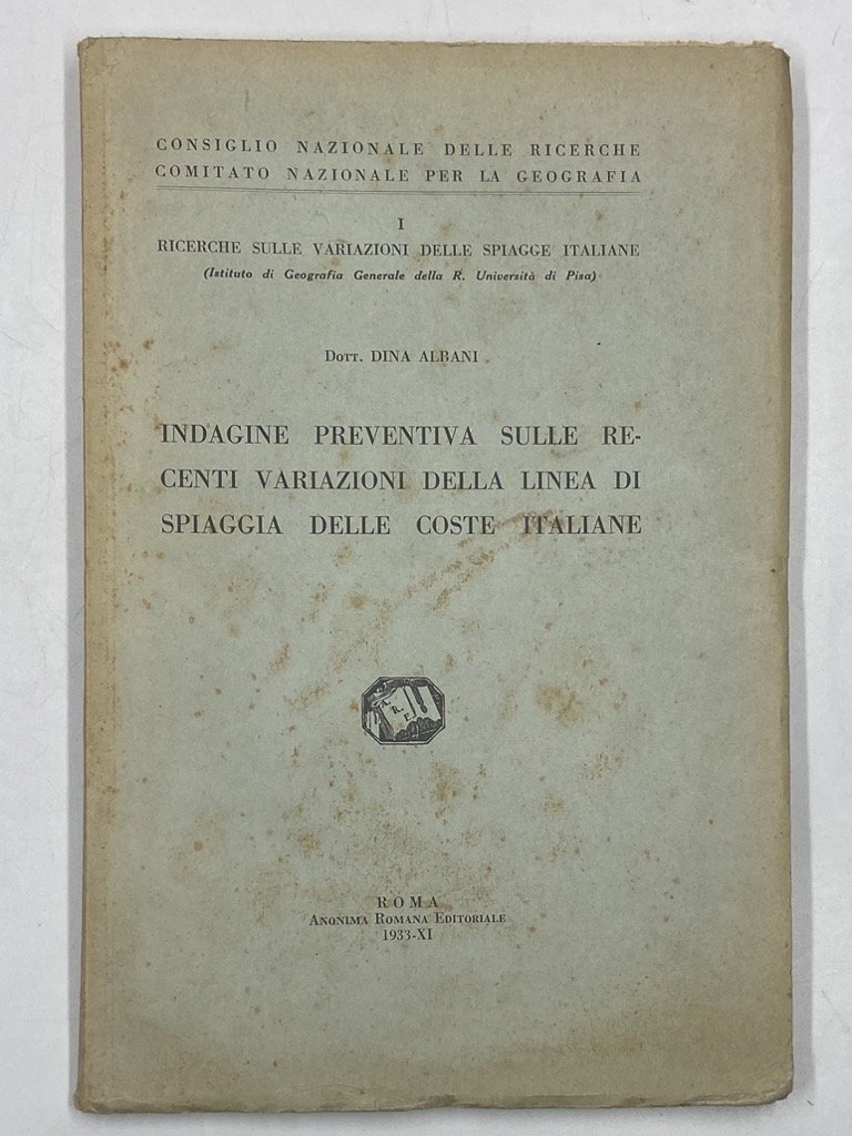 Brossura, cm16.5x24.5, pp 93 (3), tabelle e carte ripiegate. Consiglio Nazionale delle Ricerche, Comitato Nazionale per la Geografia, Ricerche sulle Variazioni delle Spiagge Italiane: I.