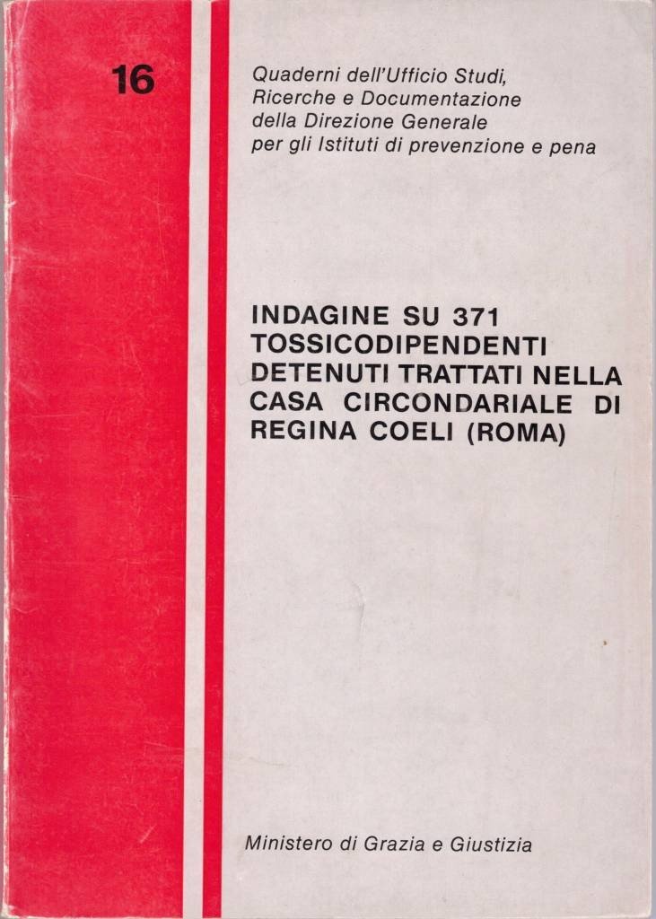 Indagine su 371 tossicodipendenti detenuti trattati nella casa circondariale di Regina Coeli (Roma), Ministero di Grazia e Giustizia, Roma 1983, pp. 203, cm 24, br. ed. Collana Quaderni dell'Ufficio Studi, Ricerche e Documentazione della Direzione Generale per gli Istituti di prevenzione e pena, n. 16. Lievi tracce d'uso alla brossura, per il resto buon esemplare.