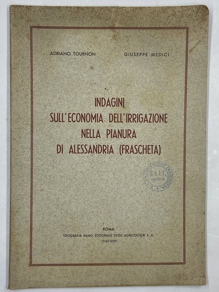 - Esemplare da studio. Timbri dell’azienda Soc. Irrigazione Fraschetta sul piatto anteriore, frontespizio e seconda carta, sul frontespizio attaccati due biglietti da visita aziendali con clips assai ossidata, e conseguenti aloni sulla carta. Fioriture sulle prime e ultime carte, tagli, brossura.
