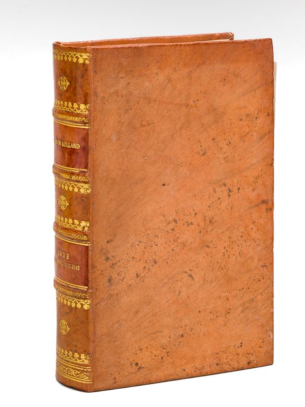 Nouvelle édition augmentée de textes inédits, 1 vol. petit in-8 reliure pleine basane racinée, dos à 4 nerfs orné, couvertures conservées, Editions Albin Michel, Paris, 1960, 624 pp. Exemplaire du service de presse marqué S.P., dédicacé par Marie Romain Rolland. Très intéressant exemplaire de cette édition en partie originale, dédicacé par la veuve de Romain Rolland, et établi dans une reliure indienne. Un tirage photographique du portrait de Gandhi est joint au volume. Bon état (qq. rouss. sur couv., le nom du dédicataire a été gratté, très bon état par ailleurs).