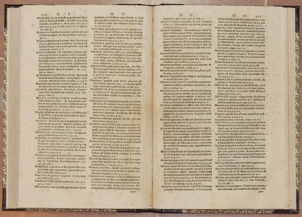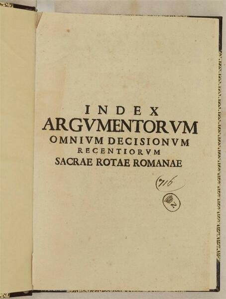 In 4. Dim. 31x21,5 cm. Pp. (6)+300. Edizione del 1666 di questo indice degli argomenti delle decisioni della Sacra Romana Rota, tribunale ordinario della Santa Sede con competenze ecclesiastiche e civili, istituito per ricevere in appello da qualsiasi altro tribunale diocesano e regionale le sentenze in seconda ed ulteriore istanza. Il volume contiene gli argomenti in ordine alfabetico delle sentenze con riferimenti della relativa sentenza raccolti a cura di Farinacci Prospero e Rossi Paolo. Antichi segni manoscritti all'interno. Purtroppo il frontespizio risulta mancante. In ottime condizioni. Copertina in mezza pelle in ottime condizioni generali con lievi usure ai margini e dorso. Legatura in buone condizioni. All'interno le pagine si presentano in buone condizioni con fioriture. Frontespizio mancante.Edition of 1666 of this index of issue of decisions of Sacra Romana Rota, ordinal trial of Santa Sede with church and civil power, created to receive the trials in second chance. The volume contains issues of trials in alphabetical order with indications of relating trial collected by Farinacci Prospero and Rossi Paolo. Ancient manuscripted signs inside. Unfortunately the title page is missing. In very good conditions. Half leather cover in very good general conditions slightly worn in the edges and spine. Binding in good conditions. Inside pages are in good conditions with foxings. Title page is missing.
