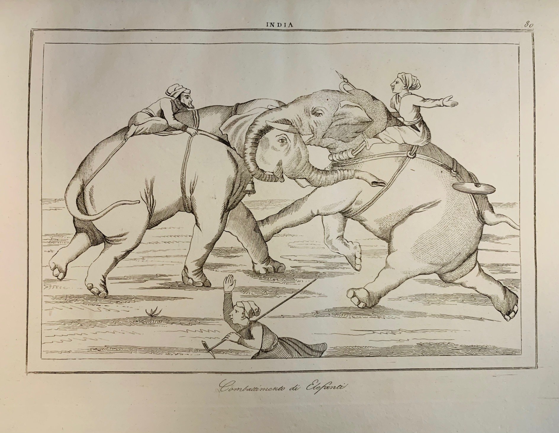 >in-8 (mm 220x150), (4), 604 e ottantasei incisioni su acciaio f.t.in b/n., tagli spruzzati blu. Legatura mezza pelle, titolo e fregi oro al dorso. Tratto dalla collana: "L'Universo o storia e descrizione di tutti i popoli". Interessante spaccato dell'India ritratta dal punto di vista geografico, politico, religioso, scientifico, letterario e degli usi e costumi. Volume riccamente illustrato da 3 carte geografiche (carta dell'India antica, India sotto la dominazione de' Mongoli, India Contemporanea), e vedute di templi e particolari della cultura indiana.