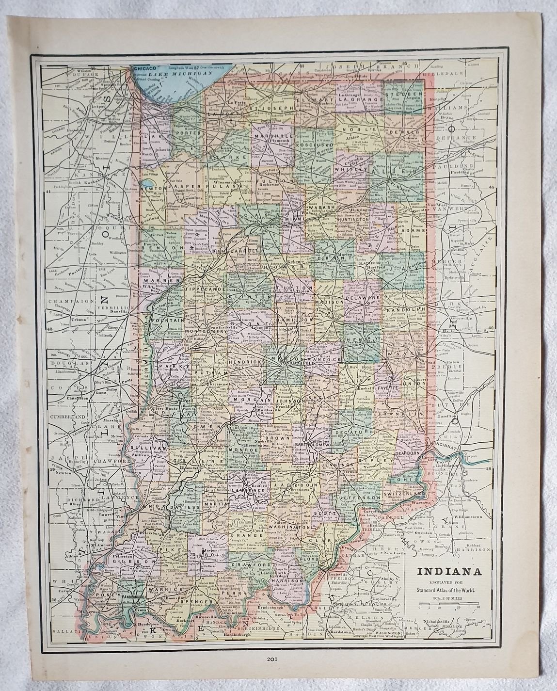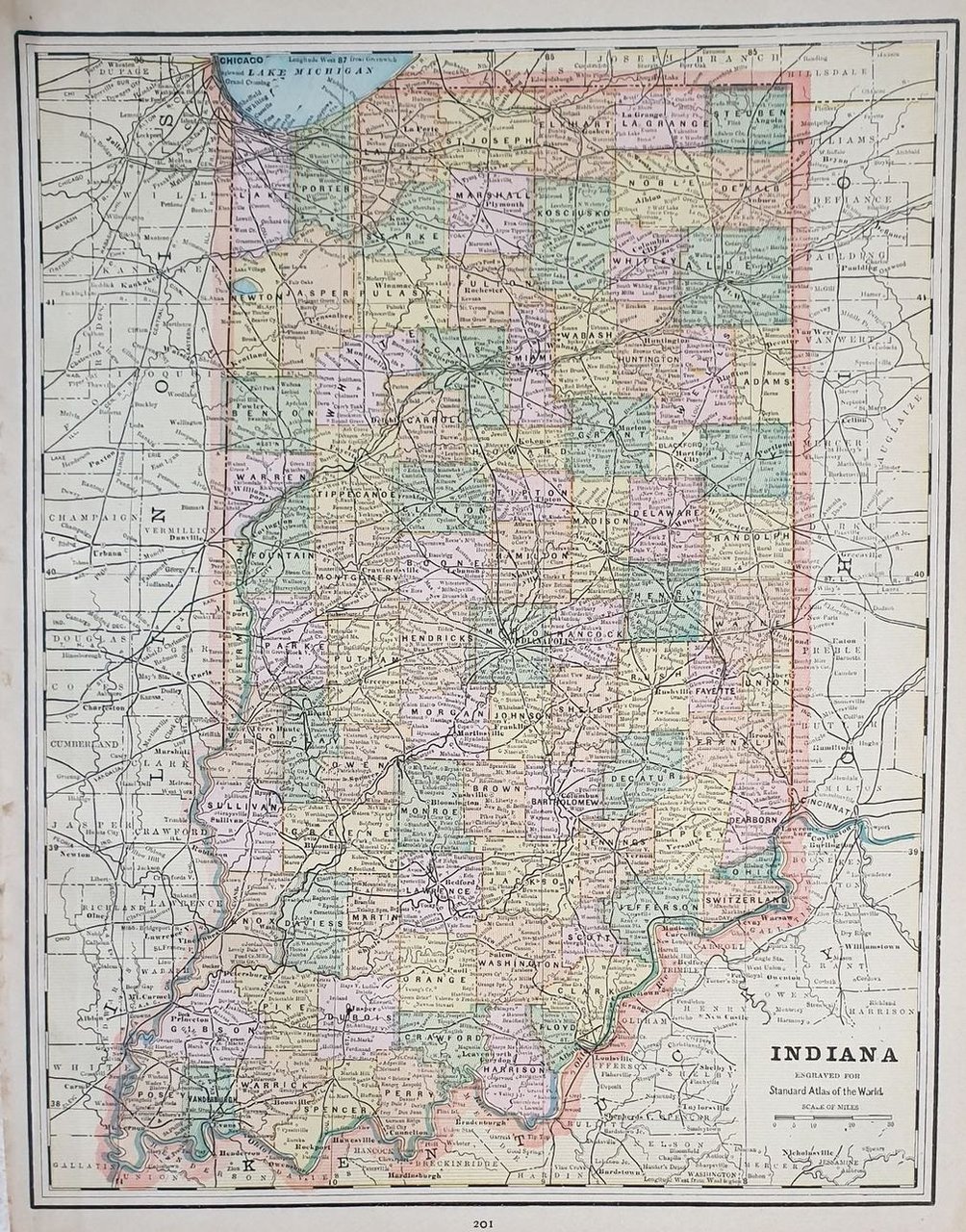 Bellissima mappa colorata del Indiana. Al verso mappa colorata di Indianapolis. Autore: George F. Cram Atlante: Standard American atlas of the world Data: 1890 circa Tecnica: litografia Dimensione del foglio: 36,5x29 cm Dimensione dell'incisione: 33x26 cm Condizioni:Buone. Very beautiful page coloured map of indiana In the verso coloured map of indianapolis. Author: George F. Cram Atlas: Standard American atlas of the world Date: 1890 circa Technique: lythography Leaf Dimension: 36,5x29 cm Engraving Dimension: 33x26 cm Conditions: Good conditions.