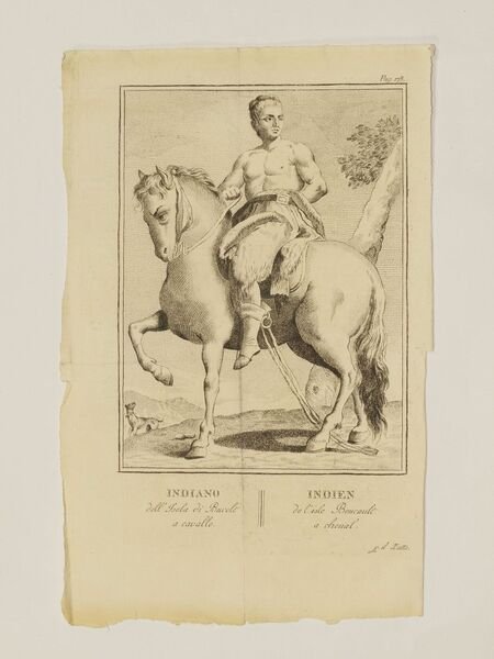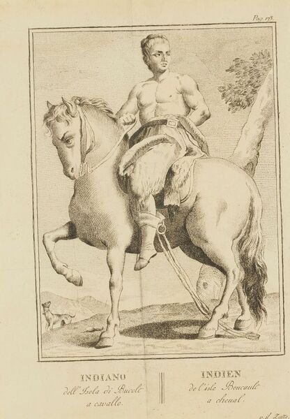 Planche estratta da libro che mostra un indiano dell'isola di Boucault su un cavallo. Atlante: Raccolta di tutti i viaggi fatti intorno al mondo da diverse nazioni dell' Europa 1794 Autore: Antonio Zatta (1757-1797) Data: 1794 Tecnica: incisione su rame Dimensione del foglio: 33,5x21 cm Dimensione incisione: 22,5x17 cm Condizioni: Buone. Alcune fioriture. Plate from a book featuring an indian from the Island of Boucault riding a horse. Atlas: Raccolta di tutti i viaggi fatti intorno al mondo da diverse nazioni dell' Europa 1794 Autore: Antonio Zatta (1757-1797) Date: 1794 Technique: Copper etching Leaf Dimension: 33,5x21 cm Engraving Dimension: 22,5x17 cm Conditions: Good conditions. Some foxing.