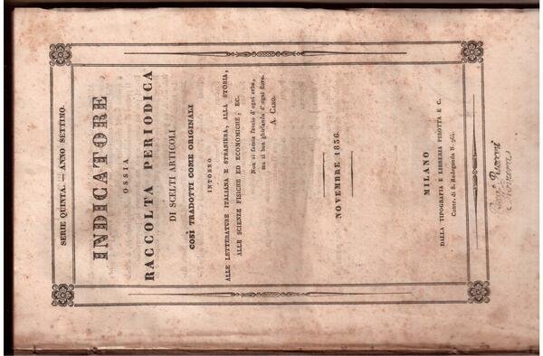 Indicatore ossia raccolta periodica di scelti articoli così tradotti come originali intorno alle letterature italiana e straniera, alla storia, alle scienze fisiche ed economiche ecc. Novembre 1836