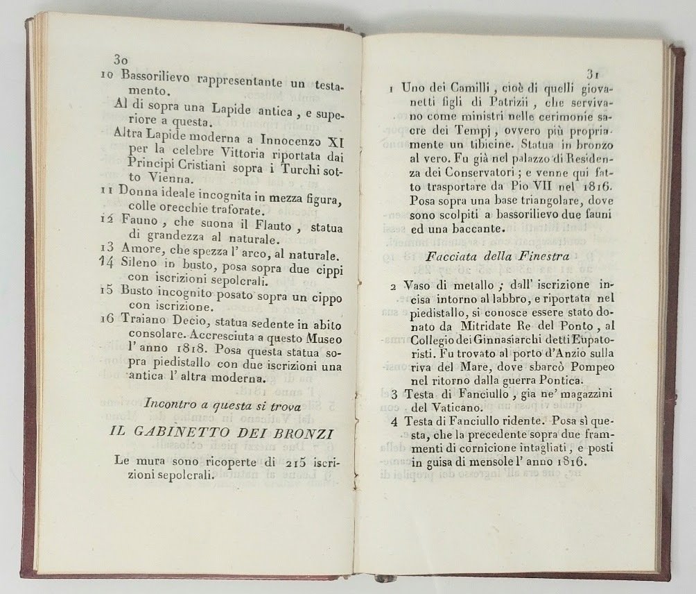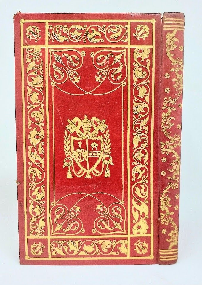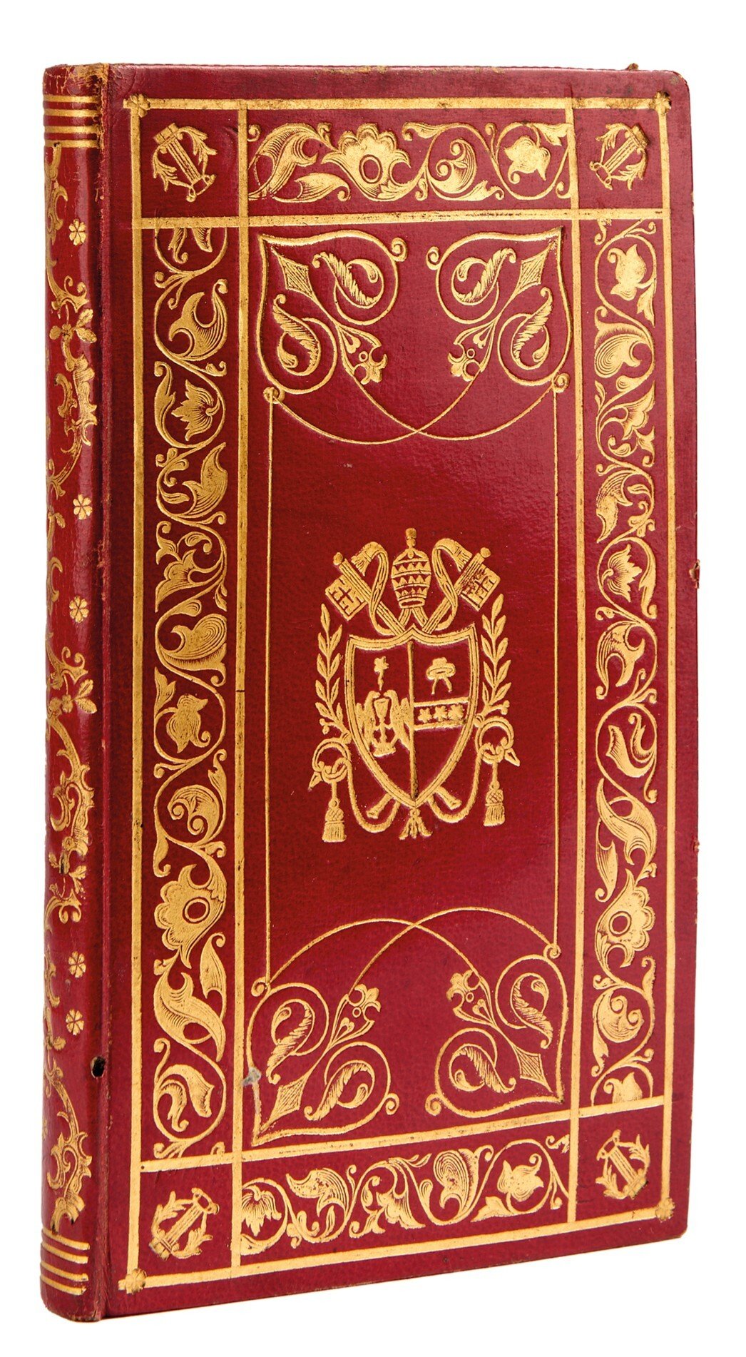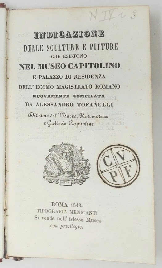 >in-8 (165 x 95mm), pp. 142, (2), vignetta al frontespizio. Legatura coeva in marocchino rosso, al centro dei piatti le armi di Papa Gregorio XVI, incorniciate da ricchissima bordura oro con motivi floreali, fogliette e 4 lire accantonate, ricchi fregi oro al dorso, tagli dorati (forellino alla cerniera ant.) Prima edizione, rarissima, di questa guida ai reperti del museo capitolino, compilata dal suo direttore. Ottimo esemplare, impreziosito dalla bella legatura romana alle armi di Papa Gregorio XVI (1831-1846) al secolo Bartolomeo Alberto Cappellari (Belluno, 18 settembre 1765 – Roma, 1º giugno 1846), 254º vescovo di Roma e papa della Chiesa cattolica dal 2 febbraio 1831 alla morte; della Congregazione Camaldolese dell'Ordine di San Benedetto. antico timbro al frontespizio.