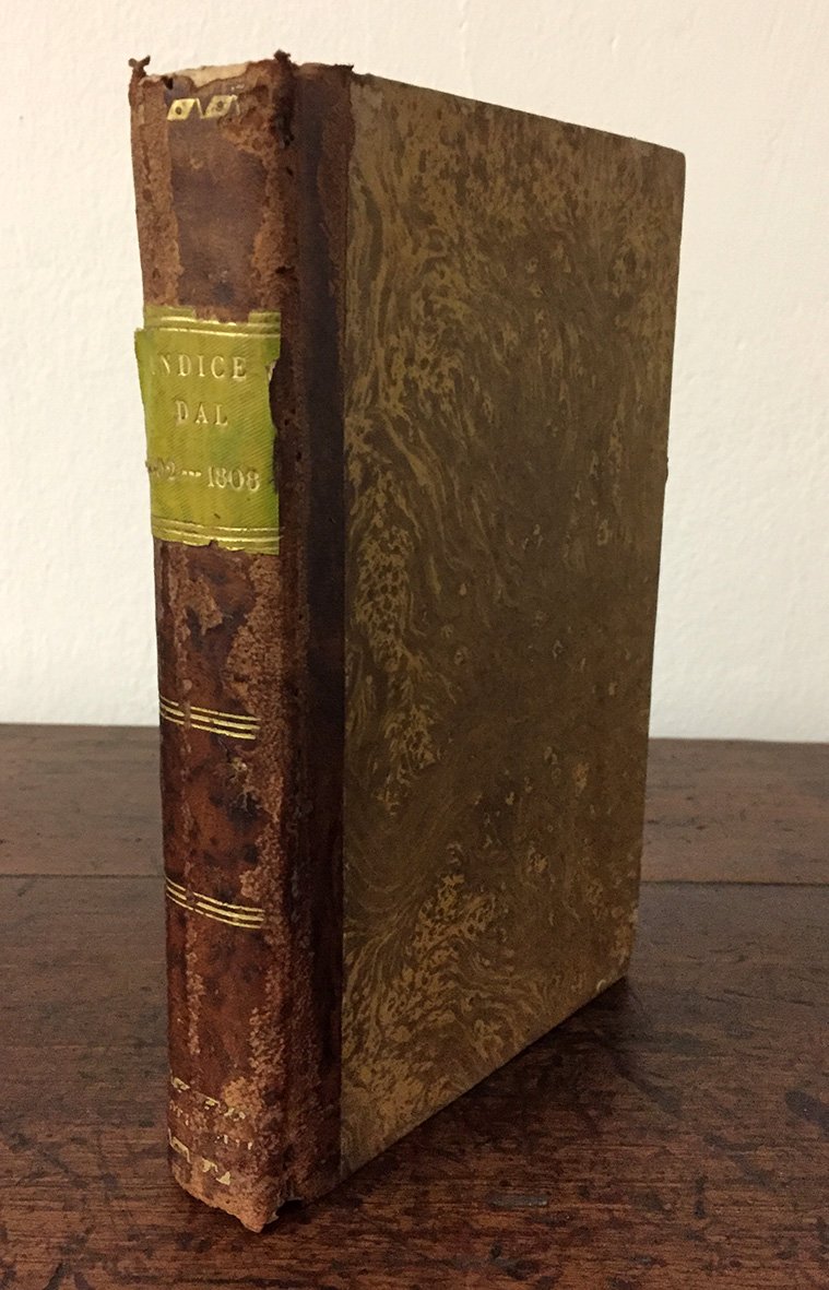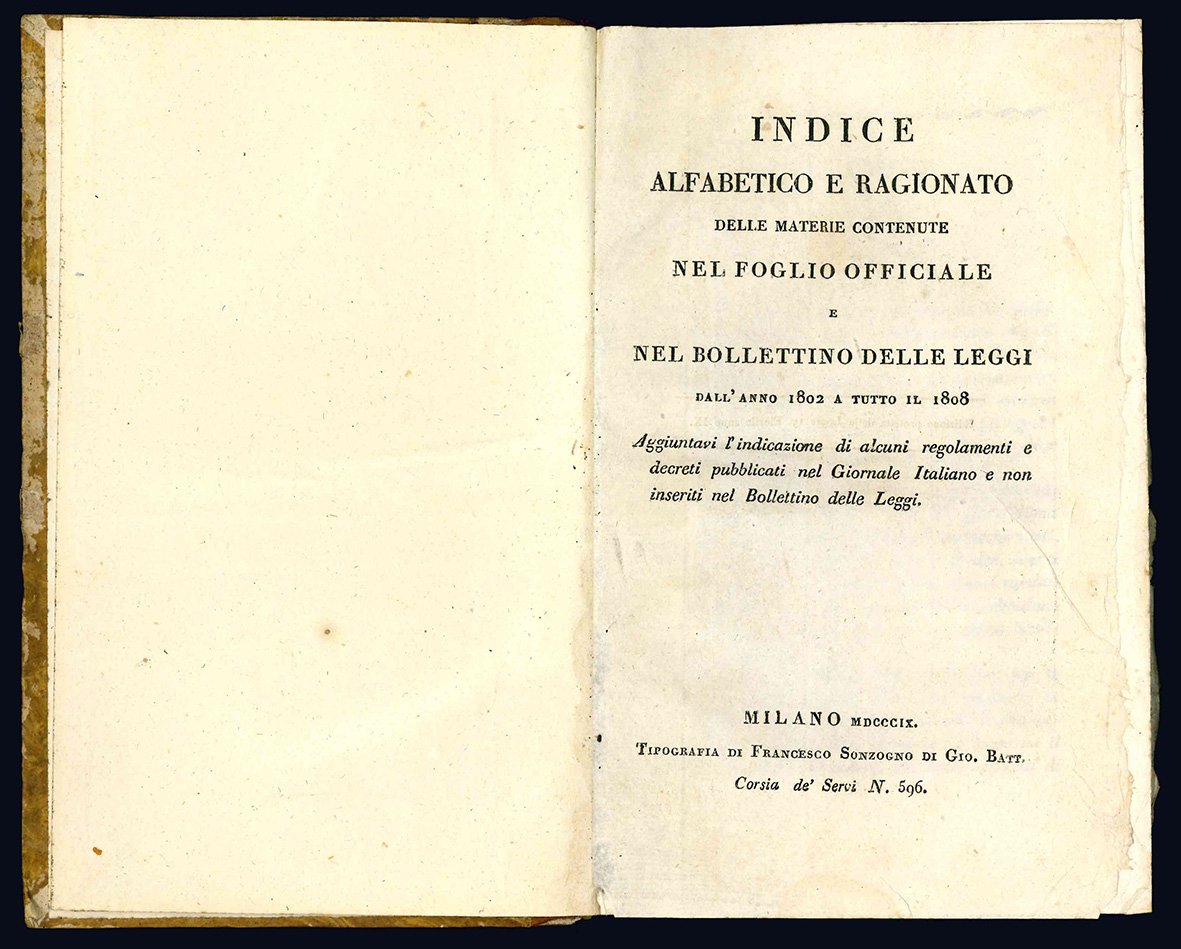 Indice alfabetico e ragionato delle materie contenute nel Foglio Officiale e nel Bollettino delle Leggi dall'anno 1802 a tutto il 1808. Aggiuntavi l'indicazione di alcuni regolamenti e decreti pubblicati nel Giornale Italiano e non inseriti nel Bollettino delle Leggi.