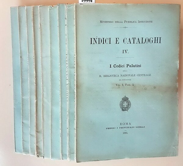 Edizione: n. 9 fascicoli (di cui uno doppio 9-10) formanti il vol. 1 relativo ai codici palatini appartenente alla collana degli indici e cataloghi (parte iv.) pubblicata dal ministero della pubblica istruzione.