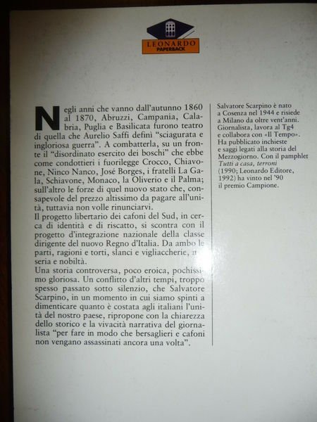 DESCRIZIONE: Leonardo Editore Milano 1991 pp. 167 br. ed. ill. in 8°. Negli anni che vanno dall'autunno 1860 al 1870, Abruzzi Campania Calabria Puglia e Basilicata, furono teatro di una sanguinosa guerra che ebbe come condottieri i fuorilegge Crocco, Chiavone, Ninco Nanco, Jose' Borges, i fratelli La Gala, Schiavone, Monaco, la Oliverio e il Palma. Il progetto libertario dei cafoni del Sud, in cerca di identita' e di riscatto, si scontra con il progetto di integrazione nazionale della classe dirigente del nuovo Regno d'Italia. CONDIZIONI: Buone/Ottime. PESO / WEIGHT: 234 gr. without package