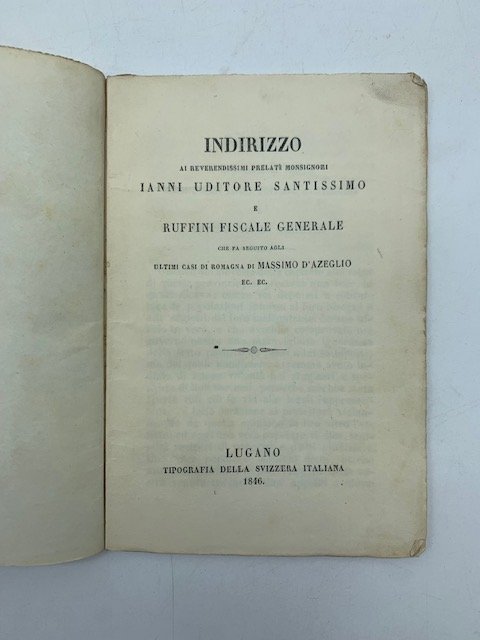 In 24 (cm 10 x 15), pp. 26 + (4 bianche). Brossura muta coeva. Opuscolo pubblicato anonimo, ma con testo scritto da Aurelio Saffi, l'avvocato forlivese futuro triumviro della Repubblica Romana, che, dopo aver accompagnato D'Azeglio nell'azione svolta da questi nelle Romagne, diede alle stampe questo saggio nel 1846 nel Ticino, presso la Tipografia della Svizzera italiana. Il papa Gregorio XVI aveva mandato a Forli', quali legati pontifici, i Monsignori Ianni e Ruffini per cercare di calmare gli animi e sedare le agitazione che si erano manifestate. Saffi, senza chiedere l'imprimatur, pubblico' questa requisitoria contro le iniquita' del Governo papale mettendo a nudo la tirannia cui erano sottoposti i popoli che soggiacevano al dominio teocratico. "Questa forte prosa di sapore foscoliano. appare mirabile per il suo ardire: mentre prega, condanna, e sotto colore di domandare provvedimenti, troppo piu' smaschera le mali arti del governo pontificio. Certo la penna e' ancor giovanile, ma sente appieno la battaglia; e le invettive fiere e generose spirano una tale schietta convinzione e insieme, cosa tanto difficile in una protesta politica, una tale ampiezza di concetto, una tale elevazione d'ideali, che risplende subito, anche senza prove dirette, la bonta' e la giustizia della causa propugnata dal Saffi. L'esito che ebbe lo dimostro' ad esuberanza: non solo nella Romagna scosse con un'eco profonda gli animi, ma lo stesso Ministero britannico la presento' al Parlamento tra vari allegati sulla politica estera." (L. Rossi, Recensione, in "Rivista italiana per le Scienze giuridiche", Torino, 1893, p. 409).