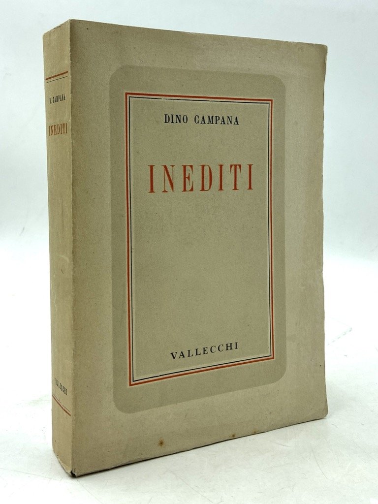 Brossura editoriale a stampa, cm 20 x 13.5, pp 345 (17), con appendice di tavole su carta patinata: ritratto fotografico, vedute della casa e del luogo di sepoltura del poeta e 10 facsimili di autografi. Buono stato, ordinaria brunitura delle carte, orecchia sul piatto posteriore e ultima pagina, prezzo cancellato e aggiornato a matita. Pubblicato parallelamente alla quarta edizione dei Canti Orfici, apparsa per Vallecchi a dieci anni dalla scomparsa del poeta, il volume curato da Enrico Falqui raccoglie settanta scritti di Dino Campana «tutti, tranne cinque, lasciati o rimasti inediti fino a poco fa»: 66 poesie, una prosa e alcuni aforismi. Il corpus principale del volume è costituito da 42 poesie e una prosa, composte tra il 1912 e il 1914, provenienti da un quaderno autografo reperito nella casa del poeta dal fratello Manlio, che aveva iniziato nel 1938 una ricerca di testi inediti su richiesta di Enrico Falqui, cui venne affidato per la pubblicazione nel 1941. Le poche pagine riprodotte in anastatica in calce a questi Inediti, dopo le note di Falqui, sono oggi l'unica traccia del manoscritto, che andò perduto durante il conflitto. Gambetti Vezzosi, p. 161.