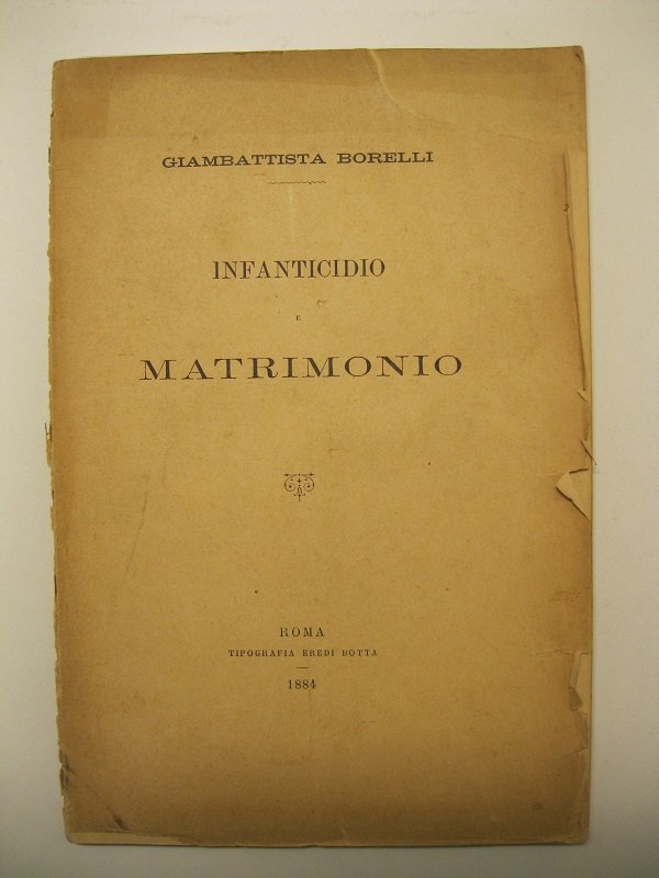 In 8, pp. 62 + (1) + (1b). Lieve mancanza all'ang. est. sup. del p. ant. Br. ed. Nell'opera l'A. mette in correlazione l'aborto e l'infanticidio con il disonore presso la pubblica opinione che deriva dal fatto di aver procreato al di fuori del matrimonio. Borelli sostiene infatti che le madri, quando non ricorrono al suicidio, all'aborto o all'infanticidio, si vedono comunque costrette all'eposizione del neonato: questa e' sicuramente per lei 'una pena morale, che le fara' maledire una societa' ipocrita, che le fa colpa di aver obbedito ad una delle passioni piu' naturali, senza farvi precedere una formalita', che sovente non e' che una menzogna ed un ludibrio'. L'A., originario di Boves, era avvocato, giureconsulto, naturalista, ma si interesso' anche di sociologia, storia e scienze naturali.