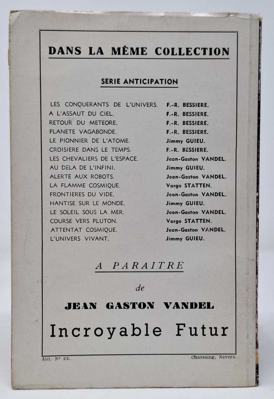Collection 'Anticipation', numero 23. Adapté de l'anglais par Ch. Gerard. Lingua del testo: francese. Formato: 13 x 19 cm circa. Pagine: 188. Stato di conservazione: superficiali abrasioni e leggere pieghette sui margini della coperta (in particolare sui margini del dorso) ma, nel complesso, un buon esemplare. Interno buono (privo di timbri, firme di appartenenza, annotazioni, sottolineature o altri segni nel testo). In brossura con copertina flessibile con illustrazione a colori di René Brantonne.