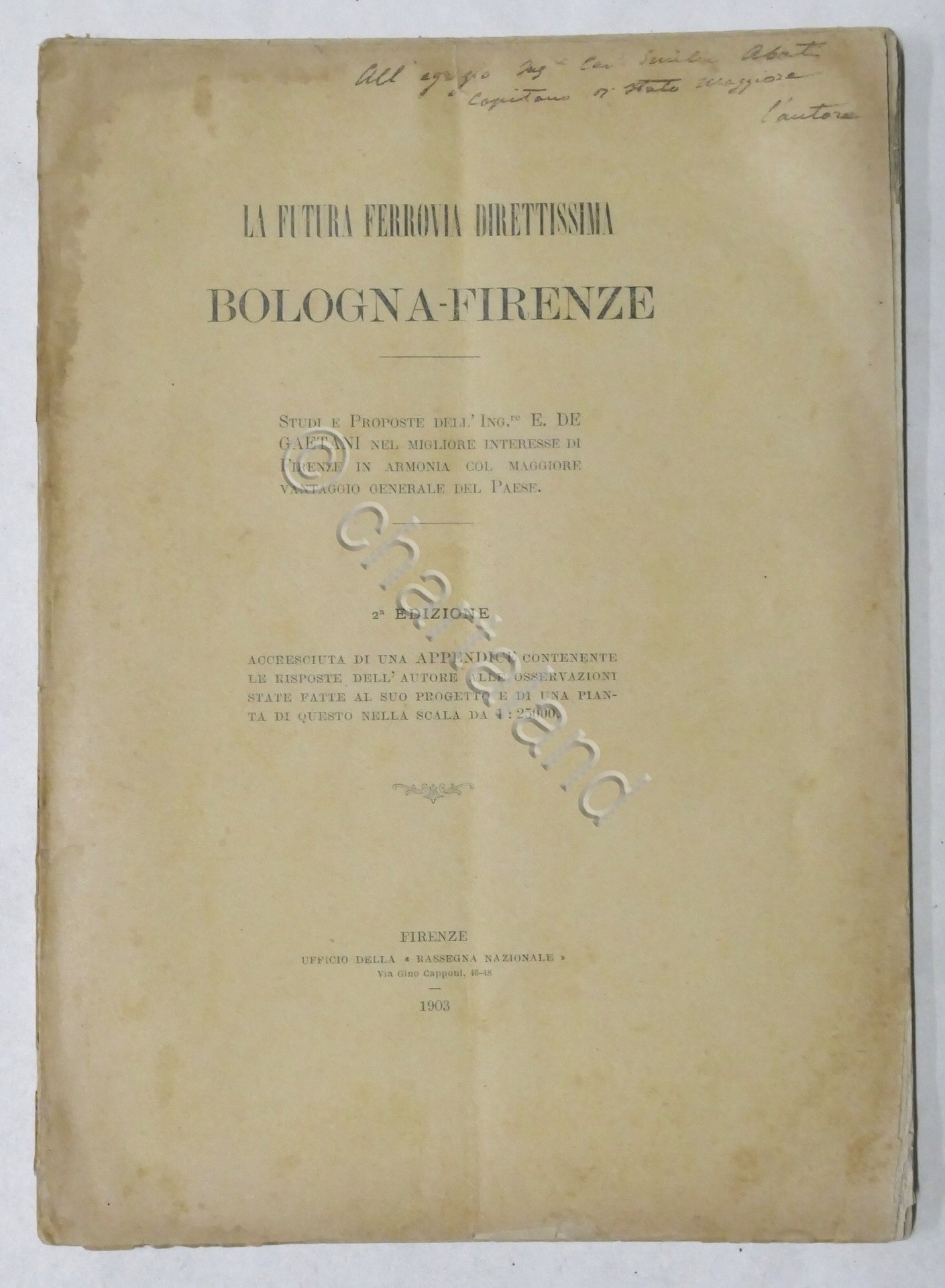 La futura ferrovia direttissima Bologna-Firenze - Studi e proposte dell' Ing. E. de Gaetani - ed. 1903