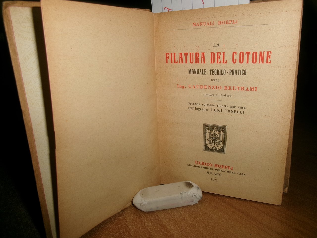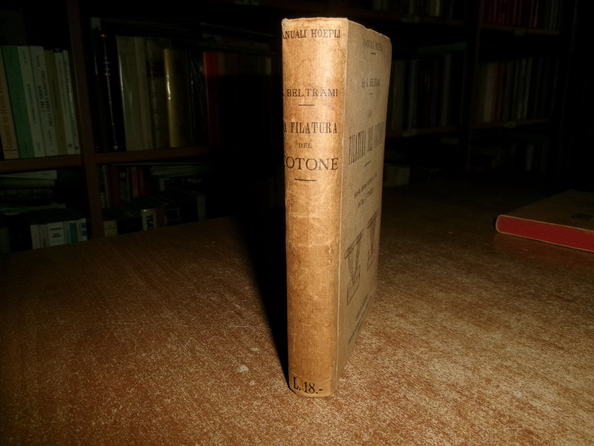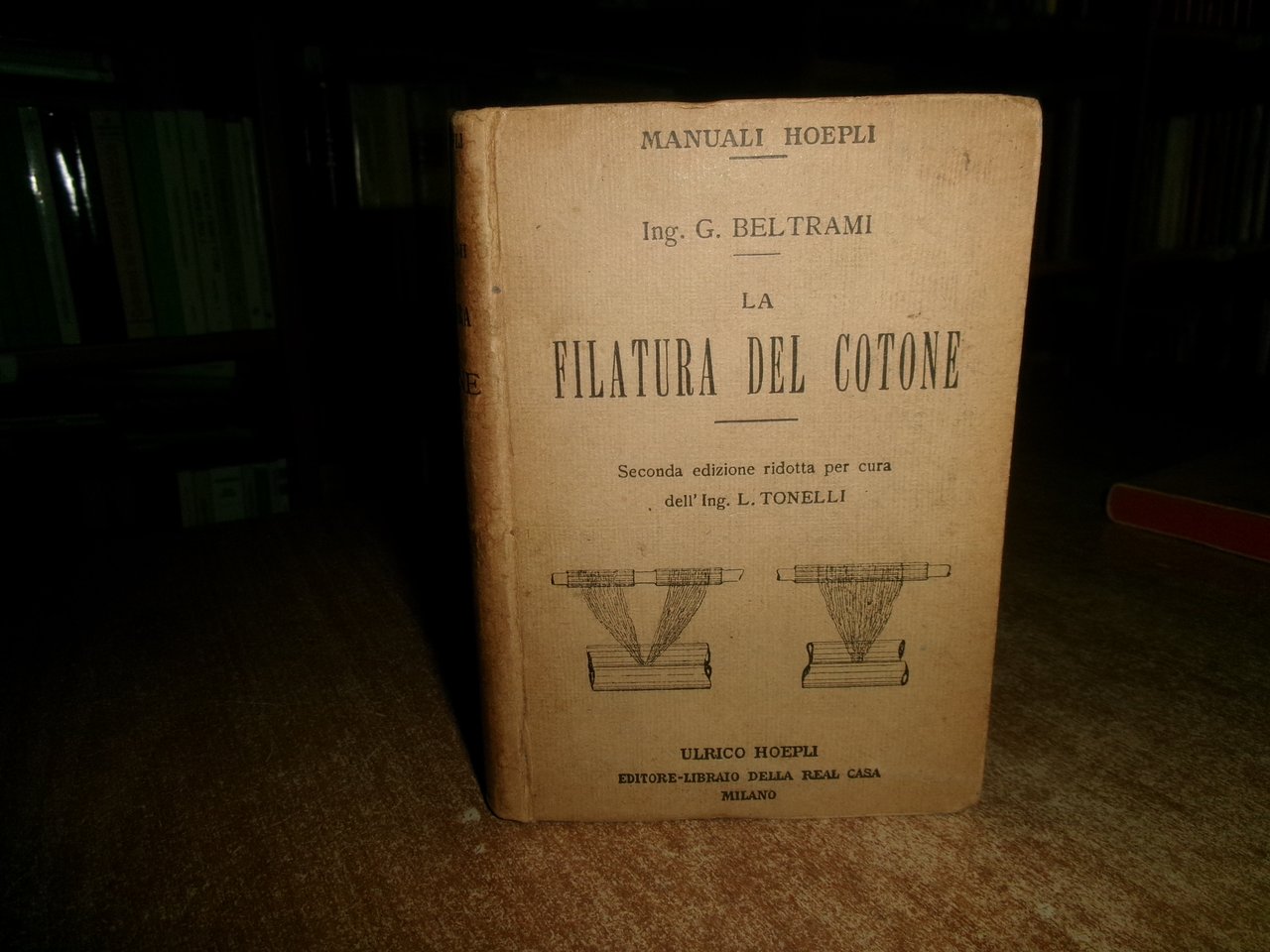 Ing. G. BELTRAMI. La FILATURA DEL COTONE. Seconda edizione ridotta per cura dell' Ing. L. Tonelli. Milano, Ulrico Hoepli, 1925. In-16°, tela edit. con tagli in rosso. xvi, 438, (22) pp. con illustrazioni n.t. Ottimo lo stato di conservazione. Neg. Hoepli mob. 19