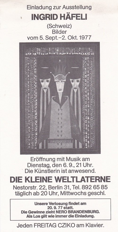 Ingrid Häfeli (Schweiz) - Bilder. Einladung zur Ausstellung vom 5. Sept. - 2. Okt. 1977.