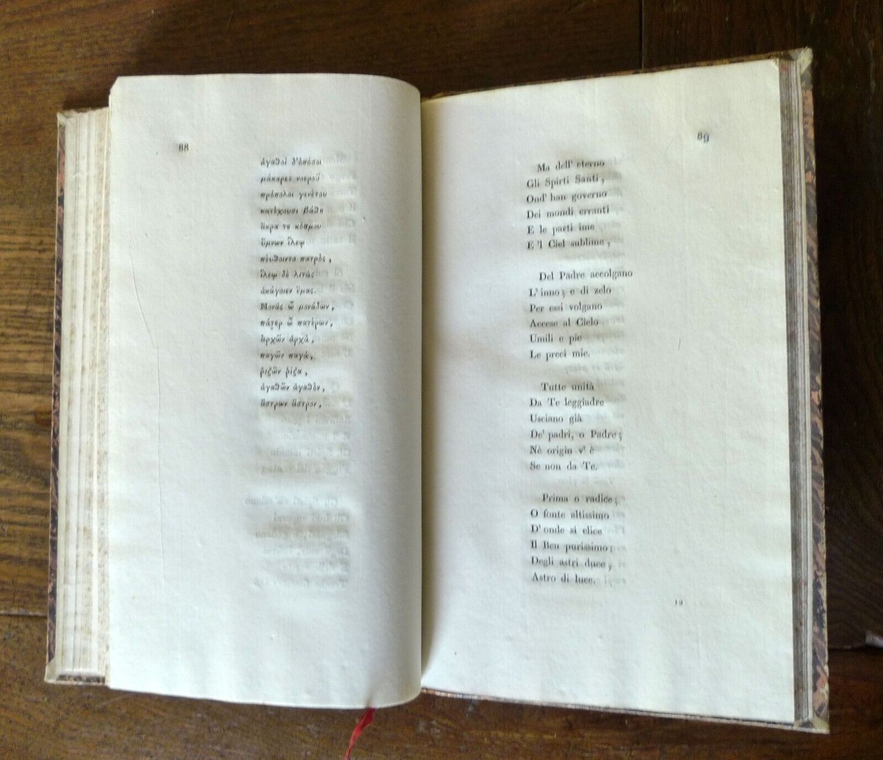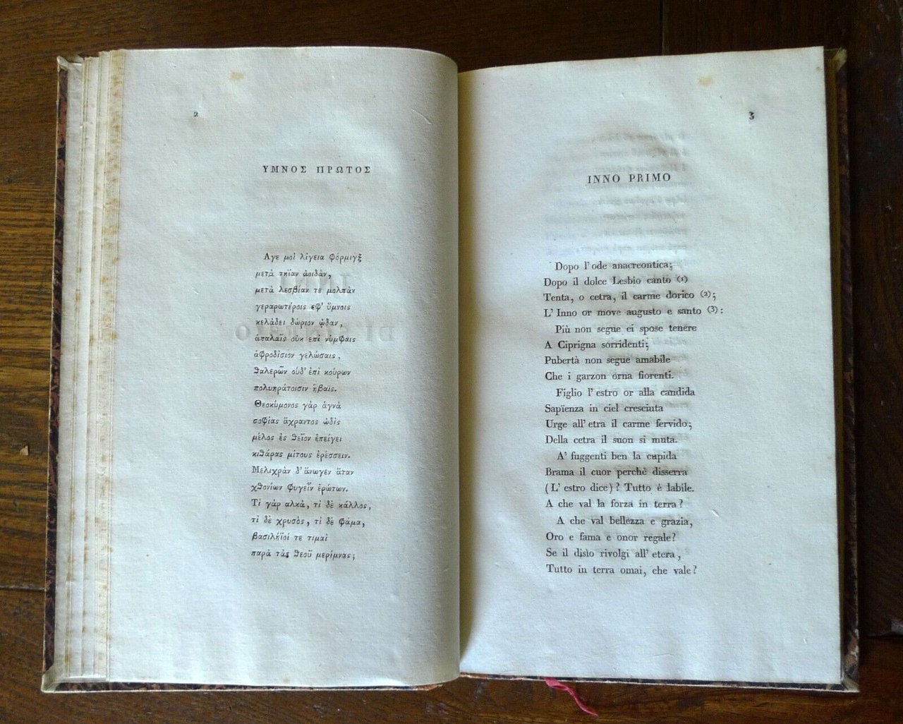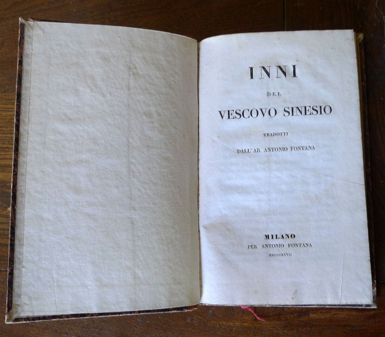 INNI DEL VESCOVO SINESIOTRADOTTI DALL'AB. ANTONIO FONTANA.MILANO, PER ANTONIO FONTANA, MDCCCXXVII (1827),copertina rigida, rilegatura coeva in mezza pelle,21,5x13,5 cm., pp.XXVII-158,testo in greco con traduzione in italiano a fronte,peso:g.300