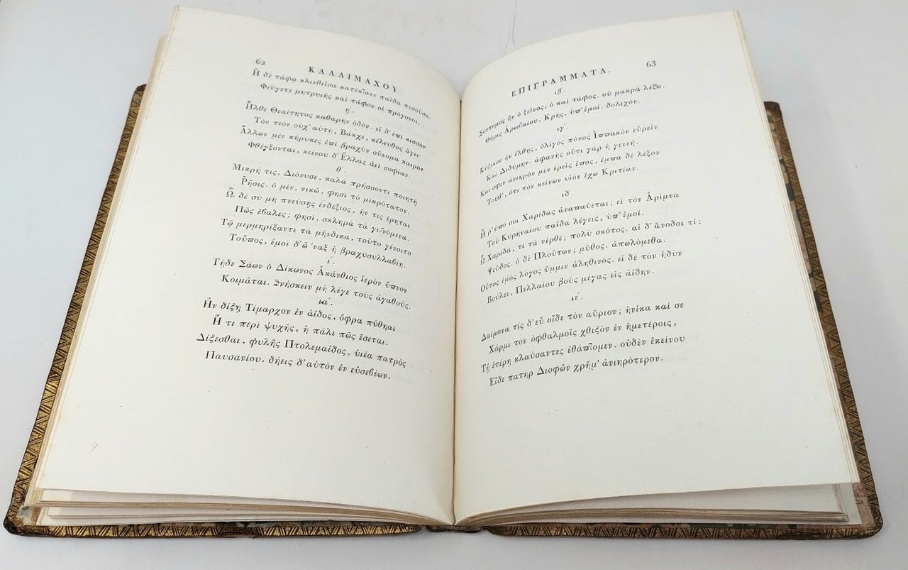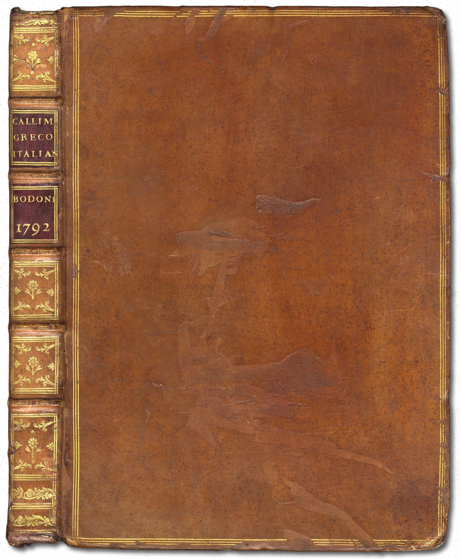 >2 parti in un vol. in-4 reale (292x208 mm.), ff. 12 nn. (occhietto, titolo, dedica di Bodoni con versi sciolti di Rezzonico, titolo ripetuto in greco), pp. IV (Notizie su Callimaco in greco), pp. 76 (Inni ed Epigrammi in greco); ff. (2: bianco e titolo in italiano), pp. 100 (testo italiano degli Inni ed Epigrammi), ff. (2, con sonetto di V. Jacobacci). Bella leg. coeva in piena pelle con triplice filetto oro ai piatti, fregi e titolo su duplice tassello granata al dorso a nervi (un po' sciupata ai piatti e agli angoli). Opera di grande bellezza tipografica, filologicamente curata dal Pagnini, autore della versione nella "toscana lingua". Fu appositamente impressa per le nozze di Carolina Teresa di Borbone con Massimiliano di Sassonia. "Un des ouvrages les plus réussis de Bodoni très extimé à cause de la parfaite beauté des types" (Geering). Ne furono tirate 4 diverse edizioni per formato e carattere: ''Si può dire che sia un libro nel quale Bodoni volle fare degli esperimenti'' (Brooks 443). La presente edizione è quella composta in caratteri minuscoli ed è completa del sonetto di Jacobacci, non sempre unito all'opera. Ottimo esemplare. Brooks 443. De Lama II, pp. 68-9. Giani, Autentiche Bodoniane, n. 21. Brunet, I, 1482. Dibdin, Greek and Latin classics, i, 371: ''Printed in capital letters, on a splendid folio page''.