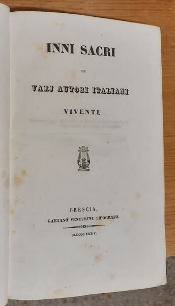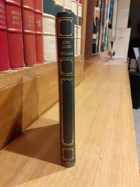 "Inni sacri" propone una raccolta di inni italiani scritti da Borghi, Mamiani, Manzoni, Arici, Carrer e Buccelleni. Il volume presenta una copertina rigida con una fantasia colorata su sfondo nero. La costa riporta il titolo, scritto in caratteri dorati, abbellito da forme geometriche. Le pagine sono ingiallite dal tempo.