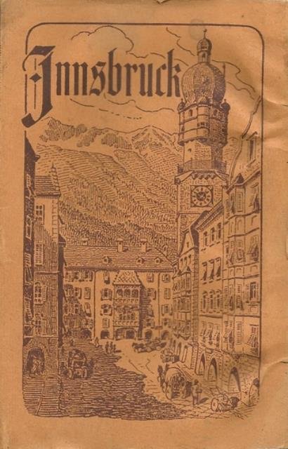 Senza indicazioni tipografiche ma 1930 circa. Piccolo album a fisarmonica contenente 10 cartoline, cm 9 x 14, bross. in carta arancione con illustrazione in delineato marrone. Le cartoline, tutte inerenti la città di Innsbruck e le sue montagne circostanti, recano il nome della ditta di Karl Redlich, hanno una didascalia in tedesco e sono tutte staccabili e da viaggiare. Tranne alcune pieghe alla brossura, molto ben conservato.
