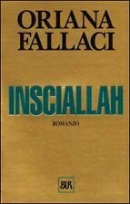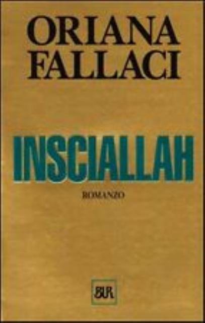 15. ed. 794 p. ; 20 x 13 cm. Opere di Oriana Fallaci, 6. «Insciallah» è un romanzo della scrittrice e giornalista italiana Oriana Fallaci. È ambientato ai tempi della guerra civile in Libano negli anni ottanta, durante l'intervento delle forze internazionali, alle quali partecipò anche l'Italia. Proprio attraverso le vicende personali e comuni dei componenti il contingente italiano nei tre mesi che intercorsero tra gli attentati di Beirut e il ritorno in patria della forza italiana, la Fallaci descrive un complesso retroscena che diventa uno spaccato della società italiana e fasi di scontri armati in cui prevalgono sequenze più dinamiche. Il titolo fa riferimento all'invocazione araba «Inshallah» ovvero «Se Dio vuole». Brossura editoriale, coperta in cartoncino flessibile plastificato lucido di colore oro con impresso il titolo al dorso e al piatto. Codice libreria 5158.