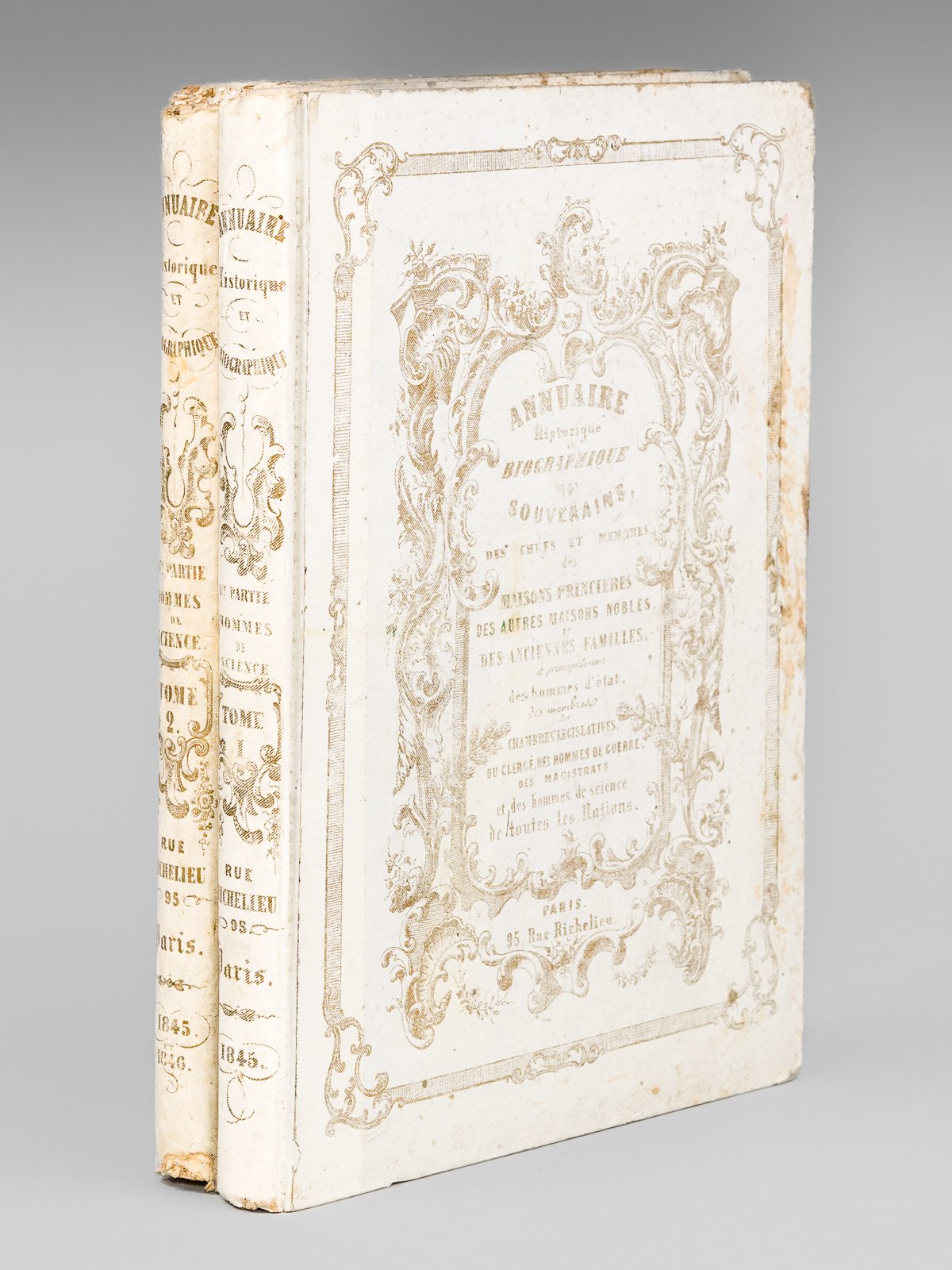 2 vol. in-4 cartonnage éditeur moiré richement orné, toutes tranches dorées, Archives historiques, Paris, 1845. Rappel du titre complet : Inscriptions historiques des Hommes vivants de toutes les Nations ; Annuaire historique et biographique contenant l'Indication des Services, Titres, Origines, Alliances et de tous les faits qui constituent les Positions Sociales. Années 1845. Cinquième Partie : Membres des Principaux Corps Savants de diverses Nations. Hommes de Sciences (2 Tomes - Complet) [Annuaire historique et biographique des Souverains des Chefs et Membres des Maisons Princières ] Rare exemplaire de cette cinquième partie théoriquement consacrée aux "savants" français ou étrangers, mais comprenant également des prima donna, des comédiens, des évêques, des artistes, etc. Parmi les personnages évoqués : Eugenio Albéri, Adrien de Balbi, Comte de Bardi, Antoine Boin, Dmitri Boutourlin, Casanelli d'Istria, Cassini, Cauchy, Caumont, Cloquet, Clutterbuck, Victor Cousin, Daguerre, Damoiseau, Sir Thomas Deane, Chanoine Desgarets, Devie de Belley, Hamilton Dickson, don Alvaro Florez Estrada, Michel Faraday, Fischer de Waldheim, sir John Franklin, sir Richard Franklin, Galloni de Modène, John Gould, etc. etc. On trouvera en fin du tome second une "Première Table générale des Inscriptions historiques et biographiques" parus dans les éditions de 1843 à 1846 de l'Annuaire biographique universel. Etat très satisfaisant (cartonnage frotté avec accrocs en coupes, bon état intérieur)