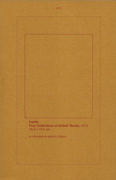 This book contains four different views of an artists’ books collection. We just sorted in chronological order and took a picture of what was inside. Vincenzo Agnetti, Carl Andre, Nobuyoshi Araki, Stefano Arienti, Enrico Baj, John Baldessari, Fiona Banner, Matthew Barney, Robert Barry, Carlo Bertè, Alighiero Boetti, Christian Boltanski, Agostino Bonalumi, Brad Brace, Stanley Brouwn, James Lee Byars, Vincenzo Cabiati, Antonio Calderara, Enrico Castellani, Mariana Castillo Deball, Eduardo Chillida, Jean Cocteau, Gianni Colombo, Pietro Consagra, Gino De Dominicis, Sonia Delaunay, Herman De Vries, Giulia Di Lenarda, Gillo Dorfles, Peter Downsbrough, Marcel Duchamp, Olafur Eliasson, Peter Fischli & David Weiss, Lucio Fontana, Tom Friedman, Natalia Gončarova, Douglas Gordon, Roni Horn, Emilio Isgrò, Alex Katz, Anselm Kiefer, Terence Koh, Jannis Kounellis, Melissa Kretschmer, Frank Kupka, Maria Lai, Sol LeWitt, Ugo Locatelli, Claudia Losi, Françoise Mairey, Man Ray, Ari Marcopoulos, Brice Marden, Amedeo Martegani, Fausto Melotti, Jonathan Monk, Mariko Mori, Bruno Munari, Mario Nigro, Mimmo Paladino, Luca Pancrazzi, Giulio Paolini, Jes Petersen, Pablo Picasso, Sigmar Polke, Arnaldo Pomodoro, Markus Raetz, Angelo Savelli, Salvatore Scarpitta, Jim Shaw, Roman Signer, Kiki Smith, Dash Snow, Ettore Spalletti, Hiroshi Sugimoto, Wolfgang Tillmans, Richard Tuttle, Erik Van Der Weijde, Bram Van Velde, Luigi Veronesi, Jan Voss, Andy Warhol, Christopher Wool, Erwin Wurm, Yasuhiro Yoshioka — Testi: Calza Leda, Molinari Elisa. F.to: 10,5x16,5; pagg. 244; BN; rileg. brossura. Editore: A&Mbookstore Edizioni, Milano, 2013.