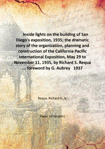 Inside lights on the building of San Diego's exposition, 1935; the dramatic story of the organization, planning and construction of the California Pacific International Exposition, May 29 to November 11, 1935, by Richard S. Requa . foreword by G. Aubrey Davidson . illustrations by the author from photographs taken during the exposition. 1937