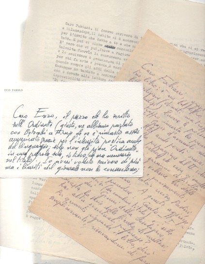 Insieme costituito da: 1 lettera e 1 biglietto autografi firmati, 1 lettera dattiloscritta con firma e lunga nota autografa; inviati al poeta e giornalista Enzo Fabiani. Datate 1954-1979.