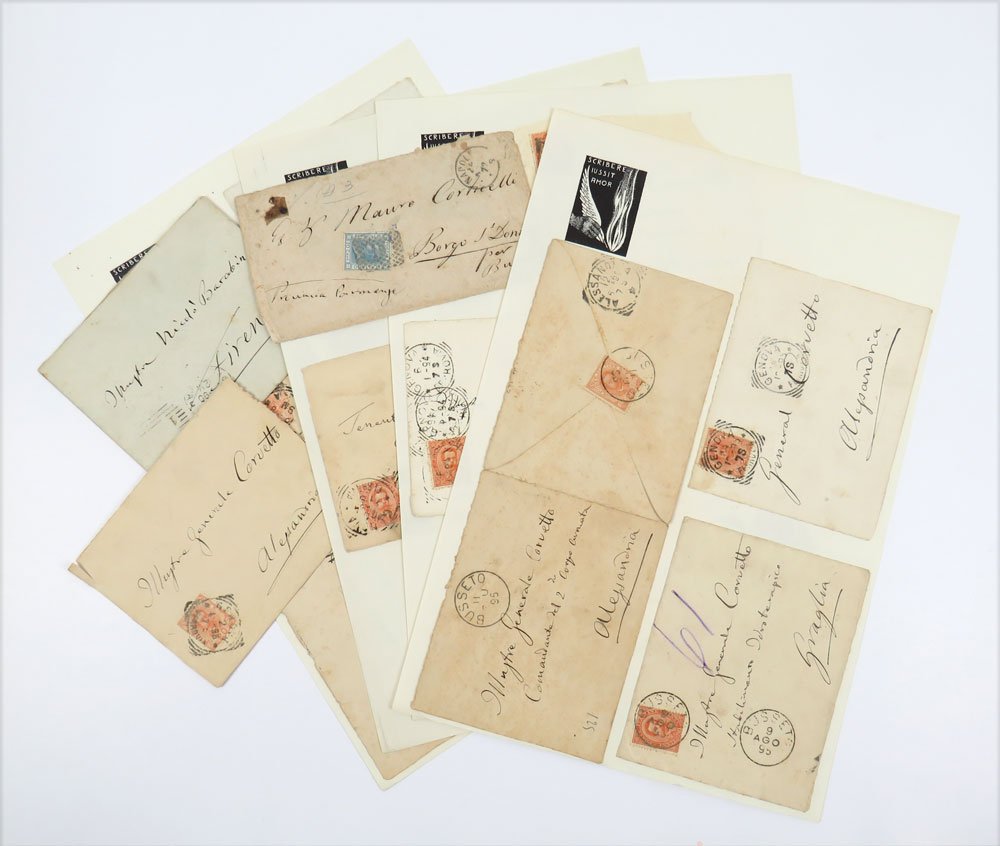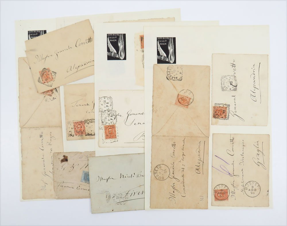 - Dimensioni varie. 13 buste, alcune con francobollo, sono applicate su cartoncino.