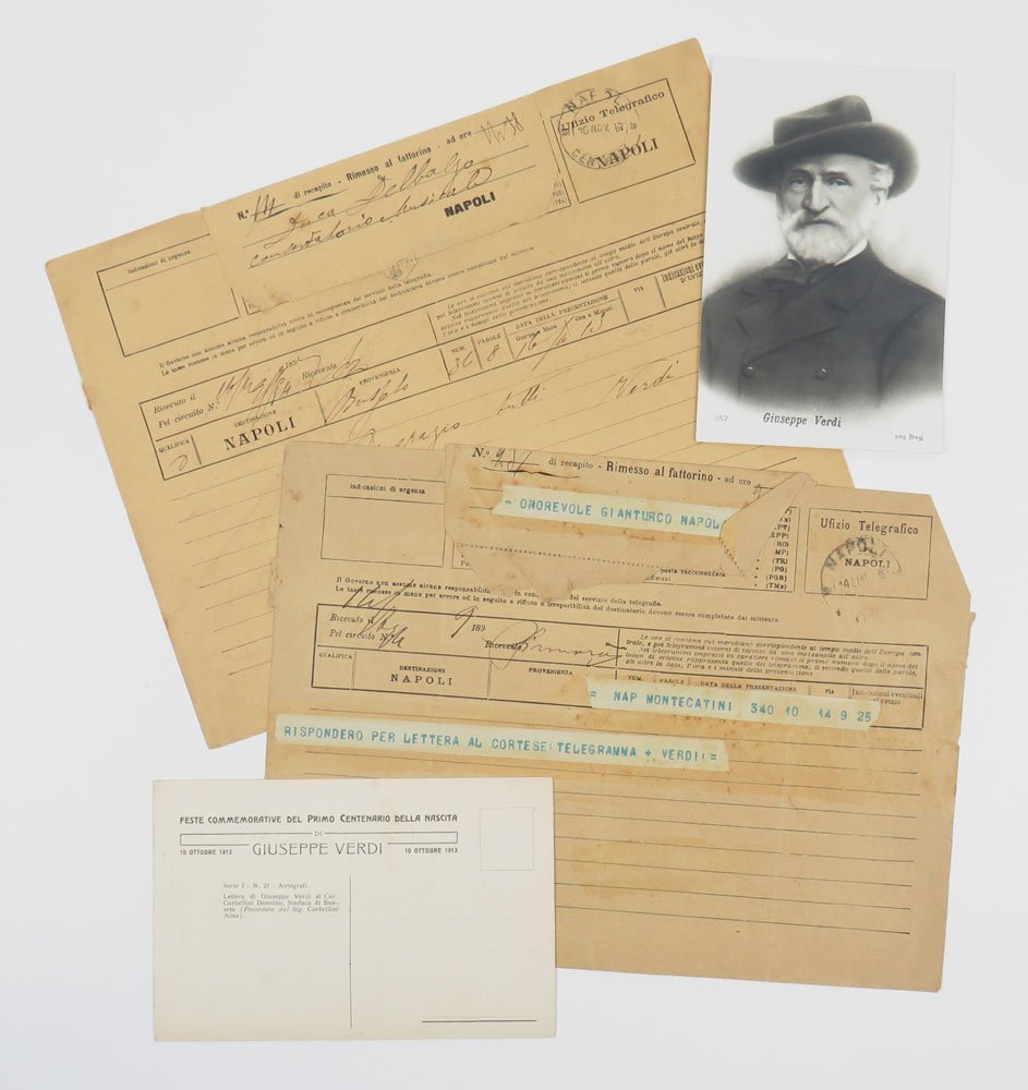 Insieme di 14 buste viaggiate con indirizzi manoscritti autografi, 2 telegrammi (non autografi) e due cartoline fotografiche commemorative di Giuseppe Verdi