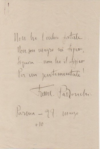 AUTOGRAFOI manoscritti, tutti a penna nera, comprendono una lettera, due cartoline postali, un biglietto e una breve composizione poetica. «Non ho l'occhio fatale / Non son magro né tipico, / Signora … non ho il fisico / Per un sentimentale! […] Parma - 22 marzo /910».