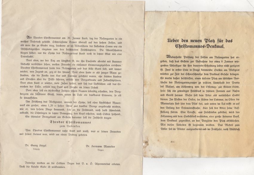 Insieme di due documenti a stampa in tedesco del 1911 poco dopo la morte di Theodor Christomannos atti a sensibilizzare alla costruzione di un suo monumento.