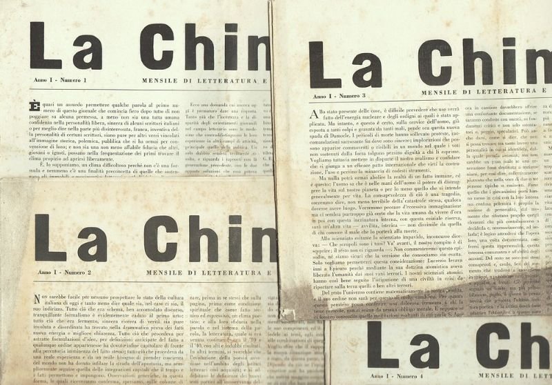 Quattro numeri, a fogli sciolti piegati a metà (cm 48,5 x 32,5), pp. 8, 10, 8 , 10, 8 e 8. Disponiamo dei numeri- (1954, Anno 1, numero 1, 4, 7), - (1955, N°-10). Responsabile Enrico Vallecchi; scritti inediti di Alessandro Parronchi, Carlo Betocchi, Giorgio Caproni, Mario Luzi, Cesare Brandi, Michele Pierri, Elio Bartolini, Giuseppe Donnini, Antonio Delfini, Luigi Santucci, Giuseppe Lisi, Antonio Manfredi, Pier Paolo Pasolini, Guido Favati, Vasco Pratolini, Angelo Romanò, Giorgio Orelli, Giacinto Spagnoletti, Domenico Rea, Carlo Montella, Tommaso Landolfi, Carlo Bo, Mario Tobino, Carlo Cassola, Oreste Macrì. Forti tracce di polvere alla prima pagina di ciascun fascicolo, con anche piccole abrasioni in corrispondenza delle pieghe che dividono a metà la rivista orizzontalmente, con minime perdite; altre tracce del tempo, ma insieme discreto e completamente fruibile. Scriveva Gianni Scalia in 'Officina' (n.2 - luglio 1955), proprio riguardo questo primo periodo della rivista fiorentina: 'Un clima di rarefatto pensiero o di gusto empirico, affidato soltanto alle proposizioni e operazioni letterarie, alle proposte di un testo, sembra costituire l'essenza della rivista. Si tratta di un rifiuto delle premesse, di una fiducia nella spontaneità creativa di alcuni scrittori, fuori della loro immagine pubblica, polemica o storica, in un confronto con i loro testi più «inediti» e con le loro intime facoltà di invenzione poetica.' In questo modo, continua Scalia, la rivista 'si avvicina alle forme di una «religione» deguisée, di una fede nella spontaneità, nella naturalezza della «verità», priva di contatti e di confronti aperti con le realtà storiche e sociali (.)' che non 'nasconde (.) una passione e una volontà di postrema eredità ermetica, di educazione sentimentale dolcemente e intensamente interiore, inquieta tra mitologismo e estetismo ideologico, dove le intenzioni di purezza si alleano alla incapacità di scoprire la propria liberazione culturale.' E conclude: 'L'incapacità di previsione (o di rischio) che è inerente al lavoro critico e ad una letteratura che voglia essere attiva e presente, la volontà di una tautologia scoperta nell'affermazione di Luzi che «la realtà si spiega solo con sé stessa» in un senso di pericoloso «immanentismo» mistico, rifiutante una concezione realmente scientifica e razionale della realtà: sono gli aspetti significanti di un lavoro ancora fondato su un’esigenza di assoluta «autonomia dell’arte».'