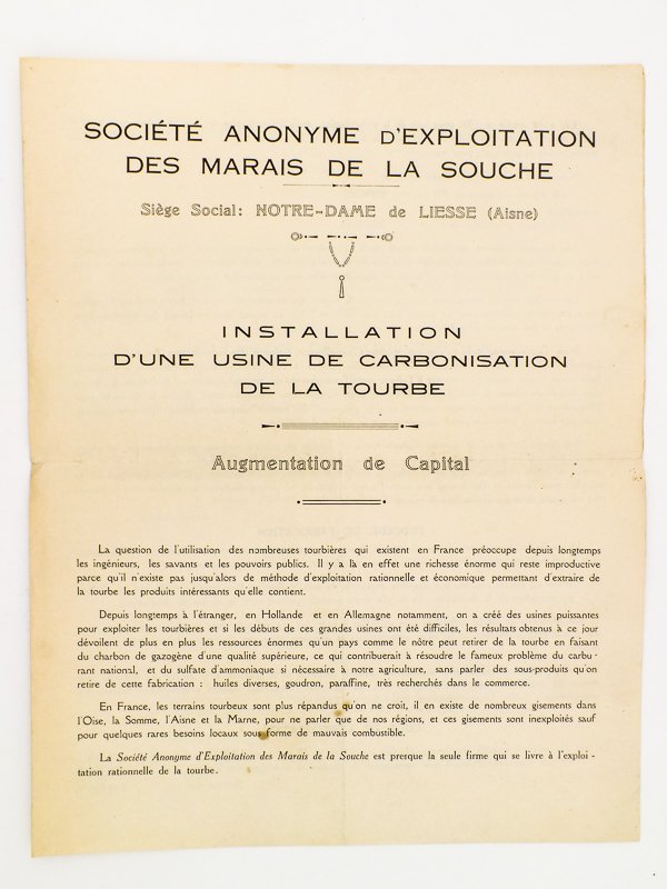 Installation d'une usine de carbonisation de la tourbe - Augmentation de capital ( Société Anonyme d'exploitation des Marais de la Souche, siège social : Notre-Dame de Liesse, Aisne ) [ Prospectus d'appel aux fonds, 1925 ]