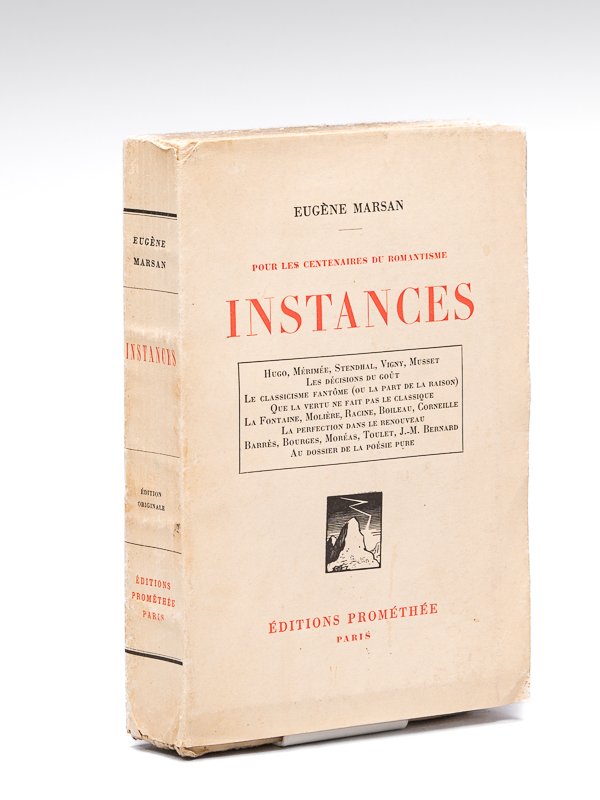 Un des 115 exemplaires sur "alfax" des papeteries Navarre numérotés de 26 à 125, 1 vol. in-12 br., coll. Essais et Chroniques, Editions Prométhée, Paris, 1930, 328 pp. Titre complet ; Instances. Pour les Centenaires du Romantisme. Hugo, Mérimée, Stendhal, Vigny, Musset - Les décisions du goût - Le classicisme fantôme (ou la part de la raison) - Quel la vertu ne fait pas le classique - La Fontaine, Molière, Racine, Boileau, Corneille - La perfection dans le renouveau - Barrès, Bourges, Moréas, Toulet, J.M. Bernard - Au dossier de la poésie pure. Bon exemplaire.